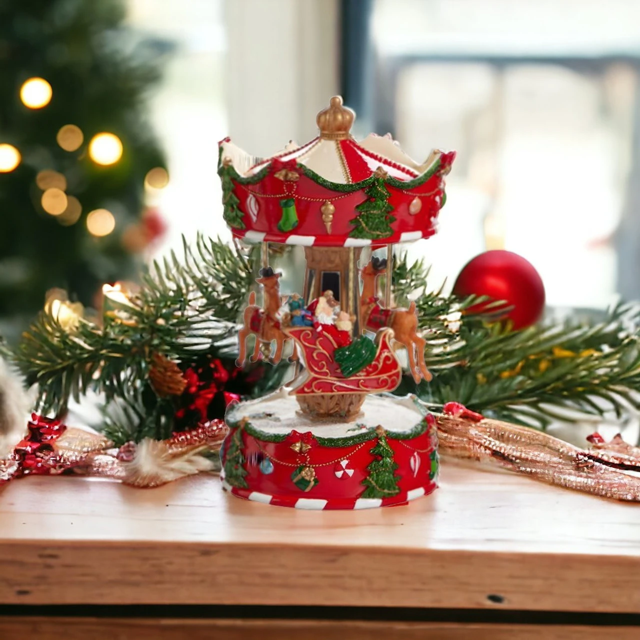Add festive charm to your holiday decor with this Anim Musical Santa’s Sleigh Carousel. Featuring a delightful carousel with Santa in his sleigh and reindeer, this figurine plays Santa Clause Is Coming To Town.