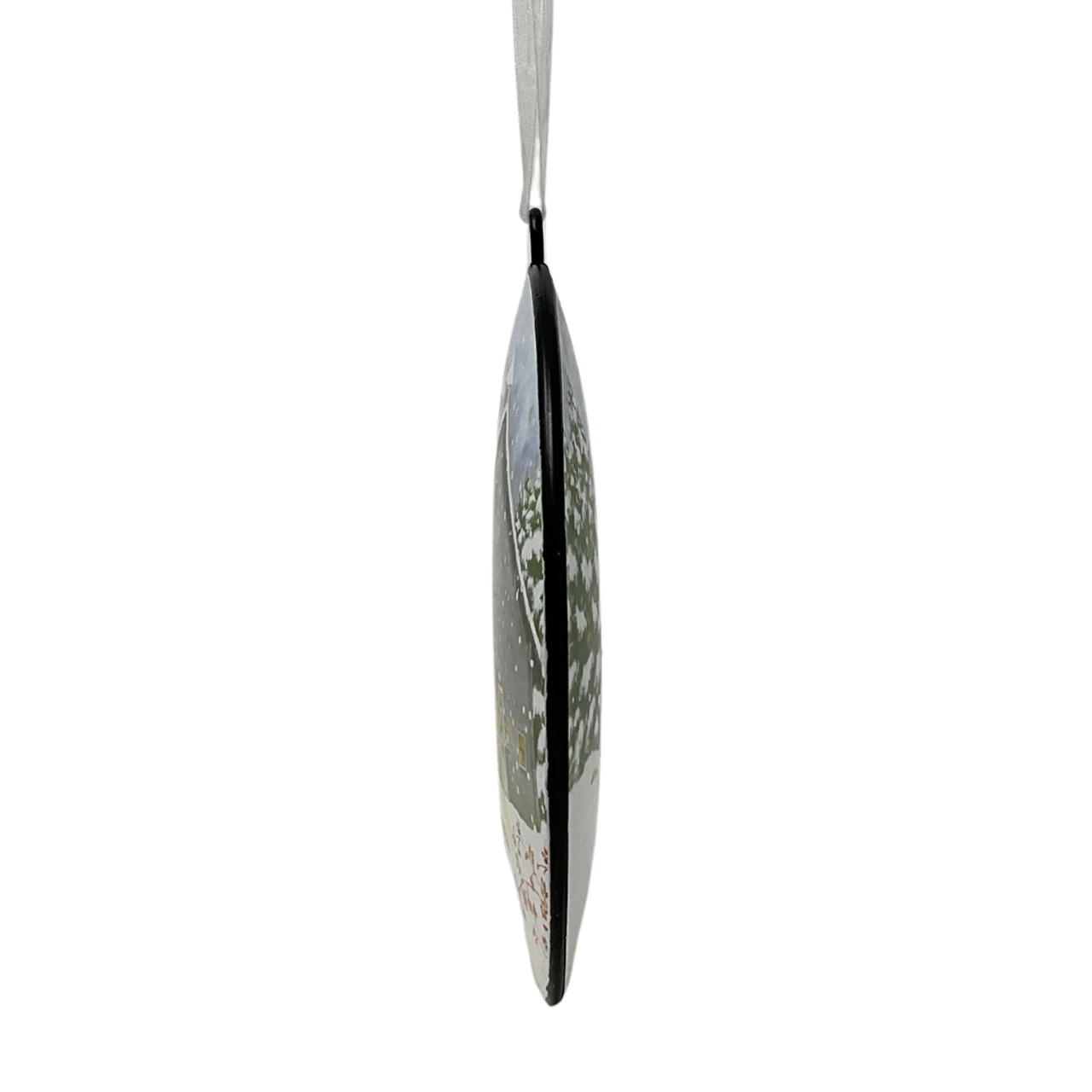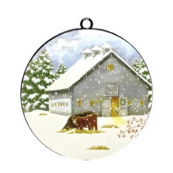 Adorn your holiday space with the pastoral charm of this 6-inch Barn With Cows Round Metal Ornament, perfect for a country-themed Christmas.