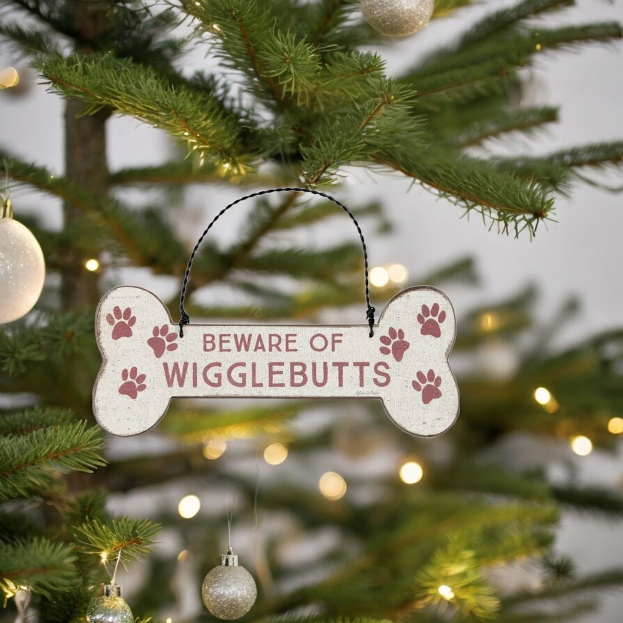 Add some humor to your home decor with this adorable “Beware of Wigglebutts” ornament! Shaped like a bone and adorned with cute paw prints, this whimsical sign is perfect for any dog lover.