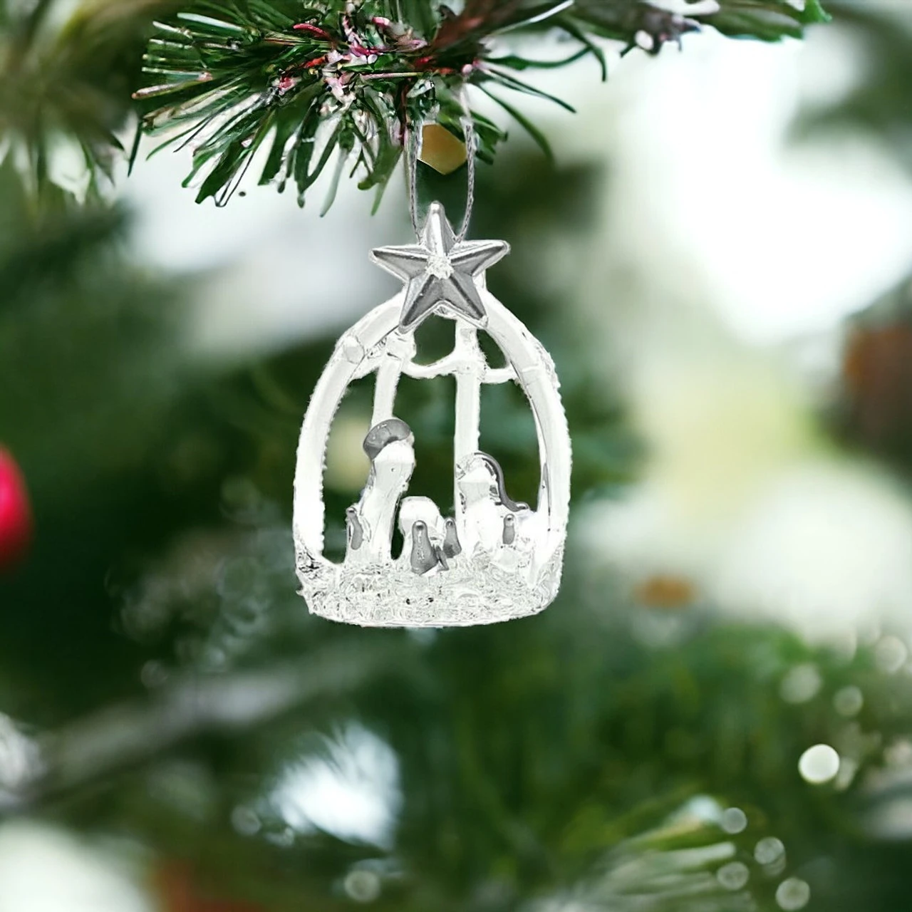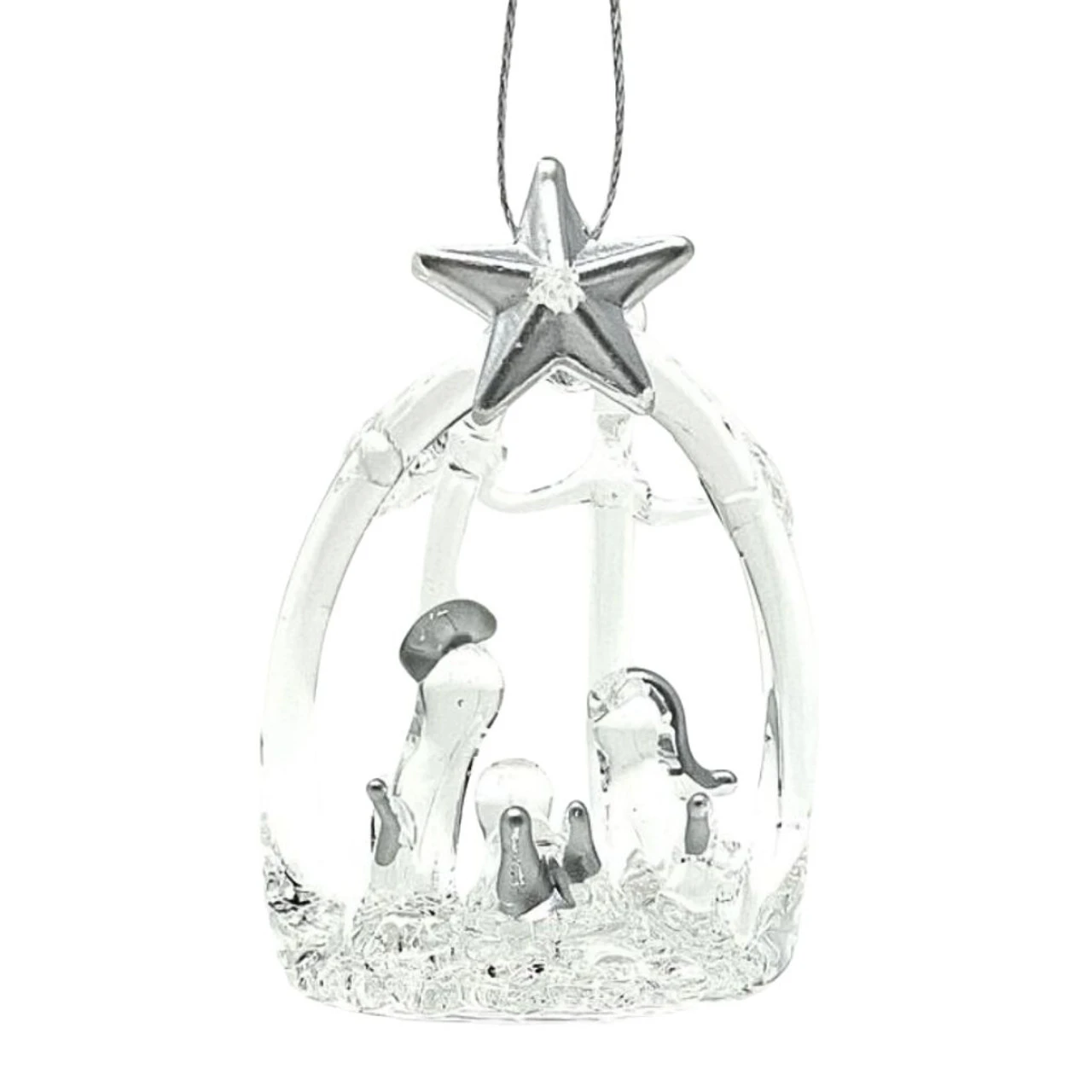 Celebrate the true meaning of Christmas with our Blessed Nativity Ornament. This elegant 3-inch ornament features a beautiful nativity scene crafted from glass, topped with a shining silver star.
