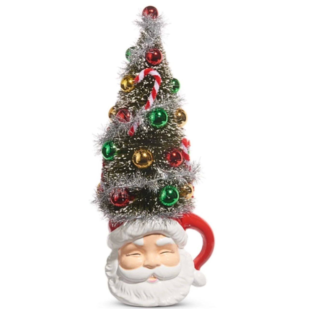 Celebrate the holidays with our festive 14″ Bottle Brush Tree Santa Mug! This delightful mug features a Santa face at the base and a charming bottle brush tree on top, adorned with colorful ornaments.