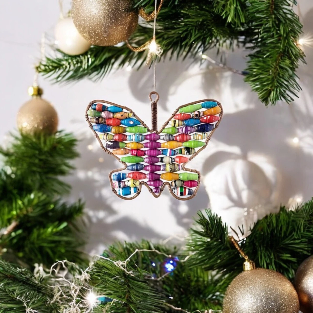 Add a splash of color to your decor with this Handmade Butterfly Ornament featuring a vibrant purple body and multicolored paper bead wings. Each bead is crafted from recycled paper and artfully arranged on a sturdy wire frame, creating a beautiful, eco-friendly design.