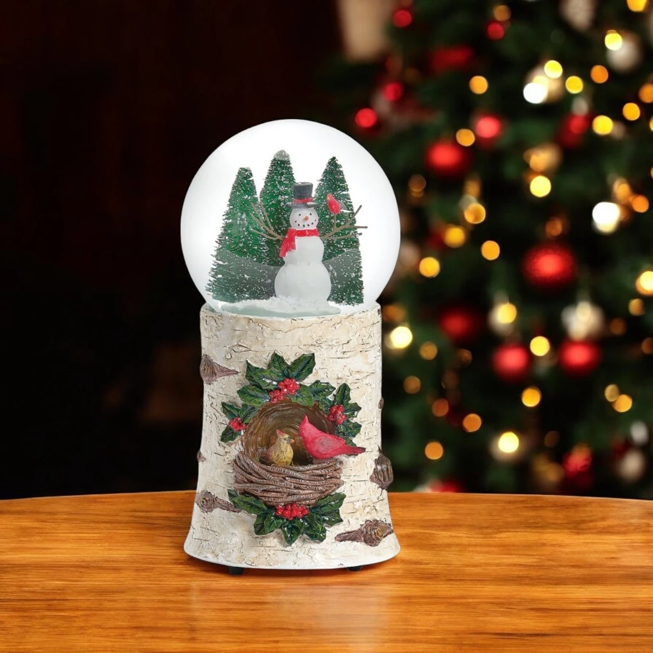 Celebrate the beauty of winter with this Cardinal Birch Base Musical Snow Globe. Featuring a charming snowman surrounded by evergreen trees, this globe sits atop a rustic birch-style base adorned with a cardinal nesting in a holly wreath.