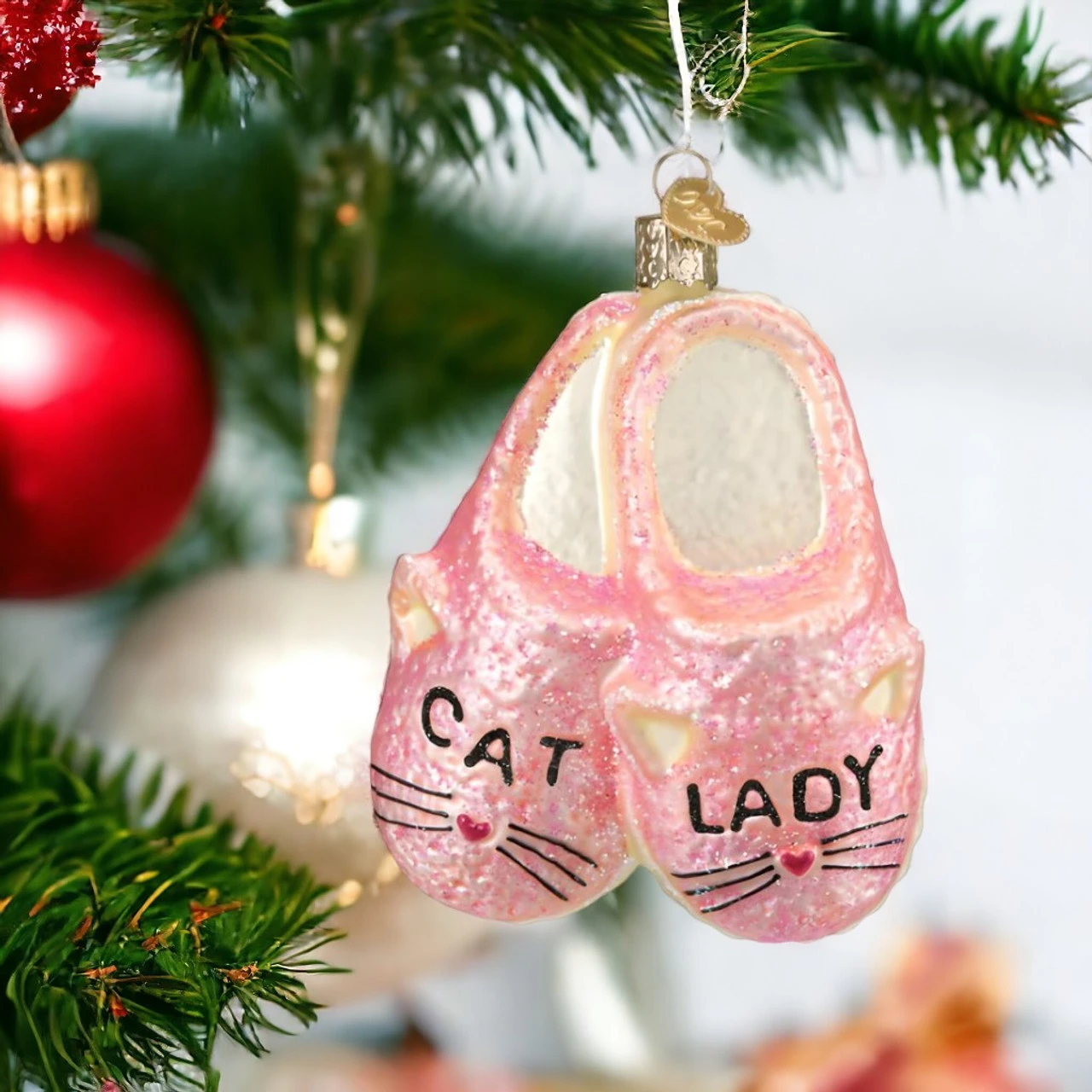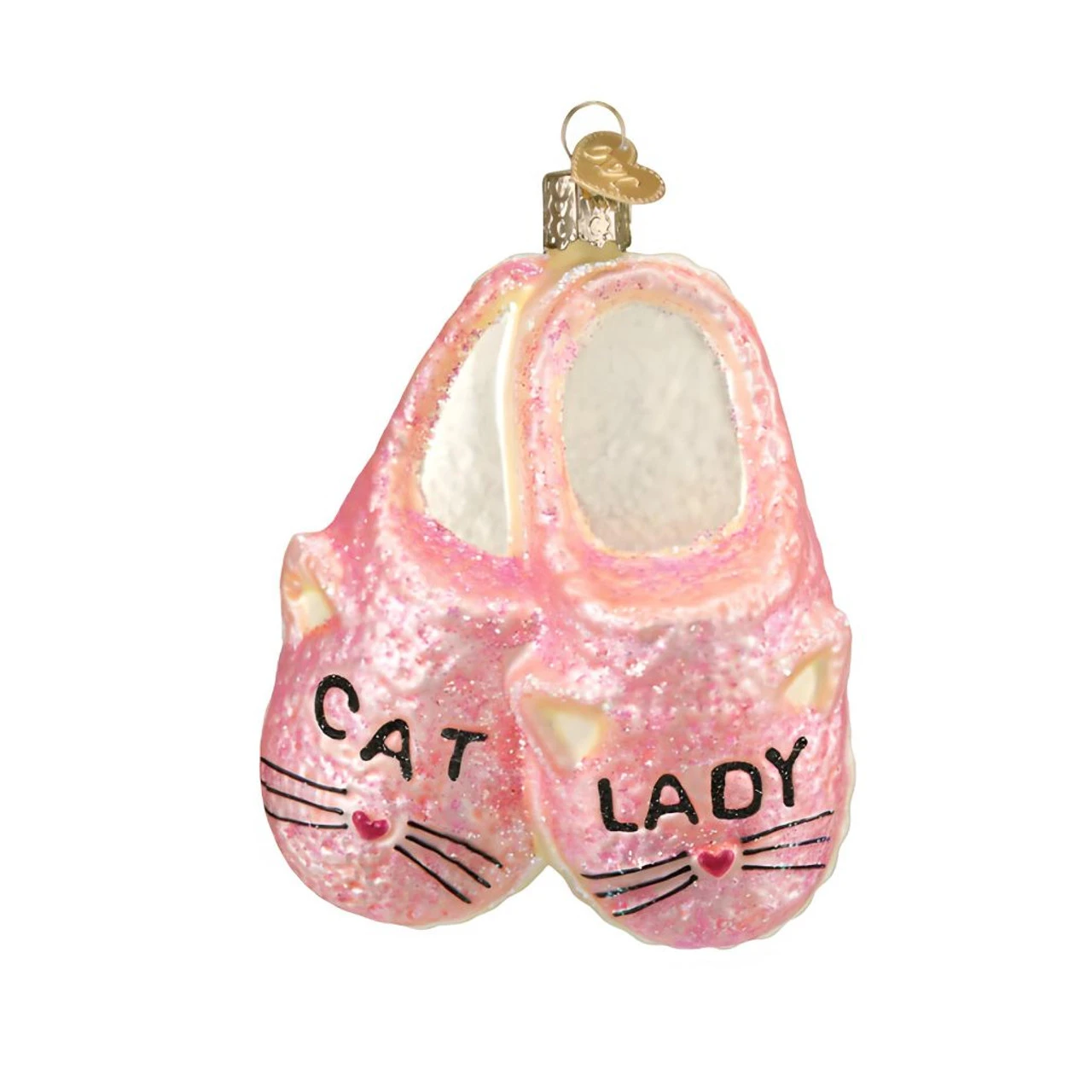 Cozy up your Christmas tree with these charming Old World Christmas Cat Lady Slippers Ornaments. Adorned in pink glitter and “Cat Lady” text, these glass slippers celebrate feline friends and cozy comforts.