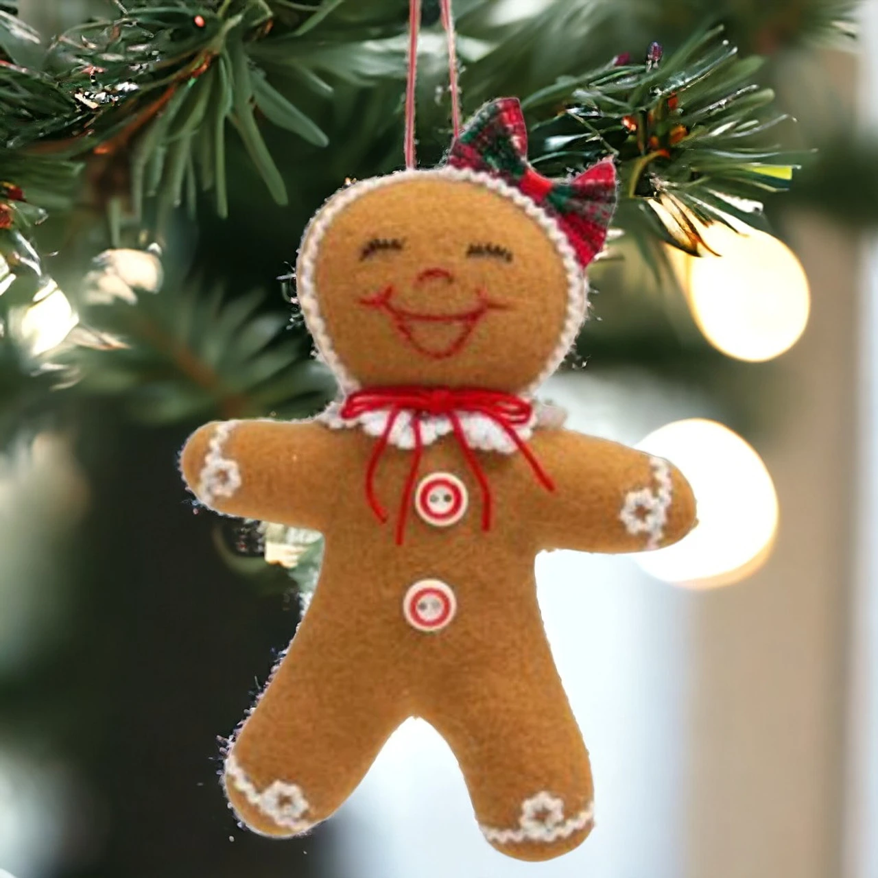 Dressed in a festive red bow and a charming smile, this gingerbread girl is stitched from soft felt and exudes a homemade allure. Her playful expression and detailed accents, like the tiny buttons and lace, invite a dash of merriment to your decor. Ideal for family trees, she’ll become a treasured part of your Christmas traditions.
