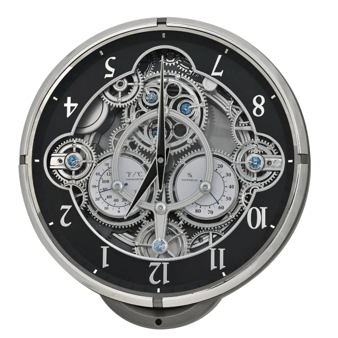 The Chronograph Black-Silver Clock combines industrial elegance with precision. This unique timepiece showcases intricate exposed gears and dials, adding a touch of sophistication to any room. The clock features both temperature and humidity gauges, giving it a functional, multi-dimensional appeal. On the hour, the gears take a move, meanwhile, the dial takes a full revolution around while playing one of 30 melodies.