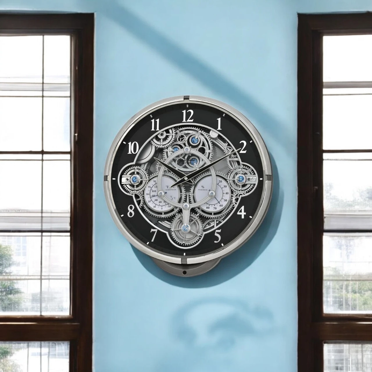 Perfect for enthusiasts of mechanical design, it brings modern charm and practical detail to your decor, making it an eye-catching centerpiece for any wall. Features include auto night shut-off, demonstration button, volume control and ON/OFF switch.Requires 2 D size batteries.