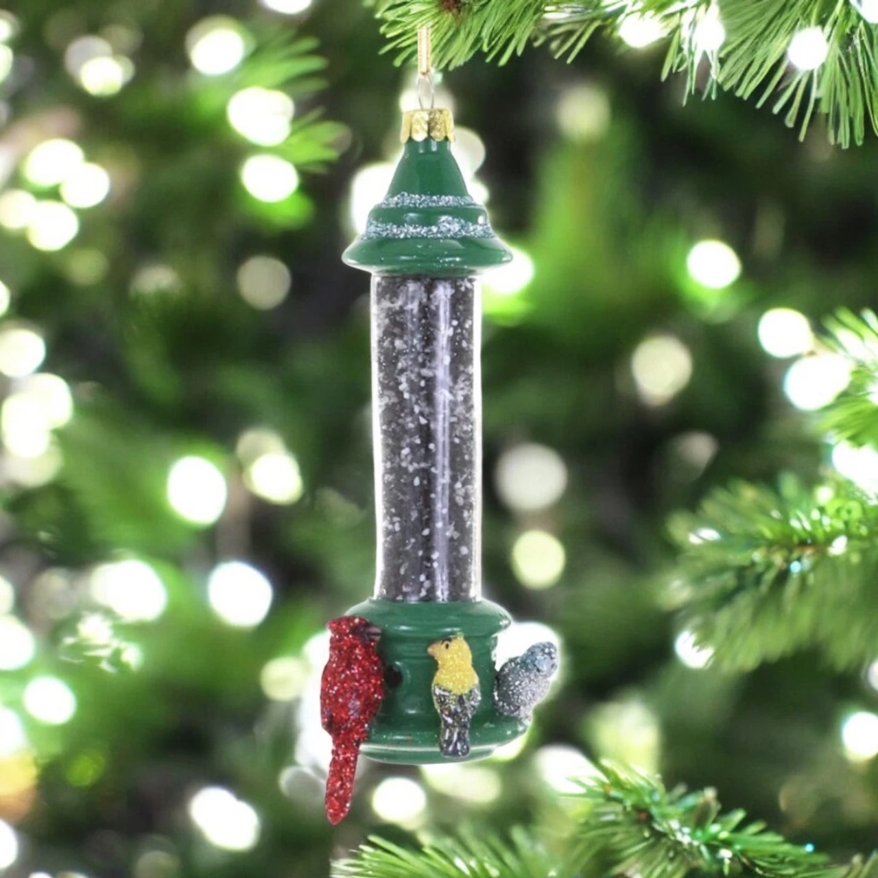 Bring backyard charm to your holiday tree with this delightful Cody Foster Bird Feeder Ornament. Designed with a green top and filled with sparkling faux seed, it features three glittery birds perched and ready to snack.