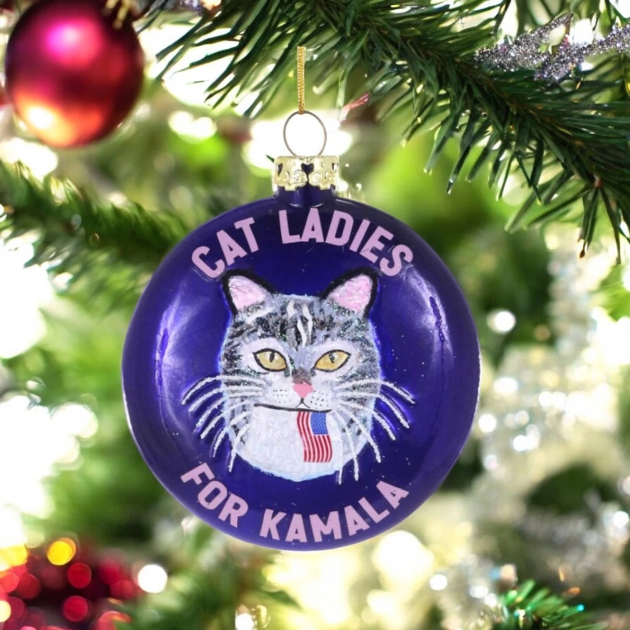 Glitter accents add sparkle to this playful and political holiday piece. Whether you’re a feline fanatic or looking to make a statement on your tree, this ornament brings a fun, bold vibe to your décor.