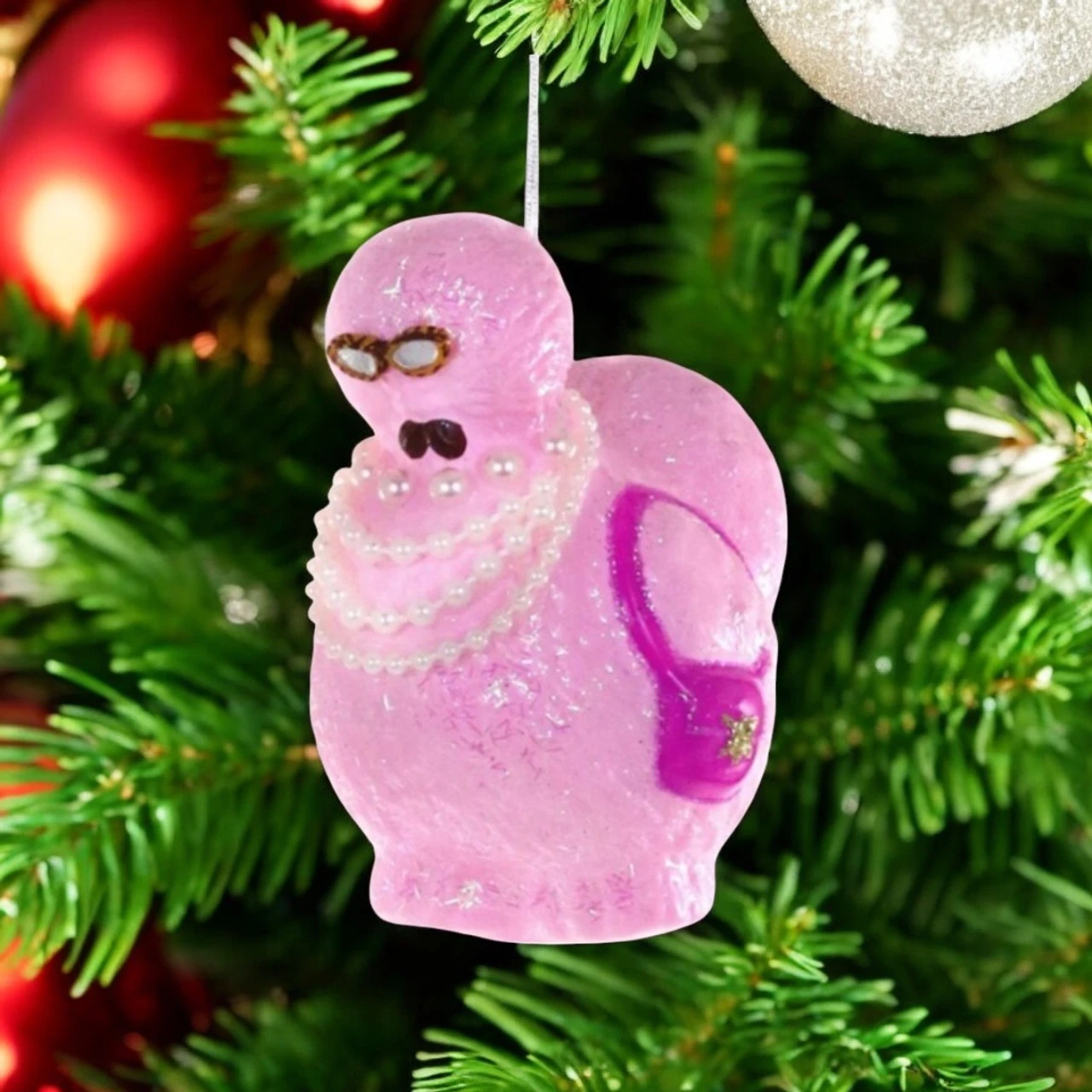 This isn’t your average barnyard bird—meet the pink poulet of holiday glam! The Cody Foster Chic Pink Chicken Ornament is all dolled up in glittery charm, sporting cat-eye glasses, layered pearls, and a stylish handbag.