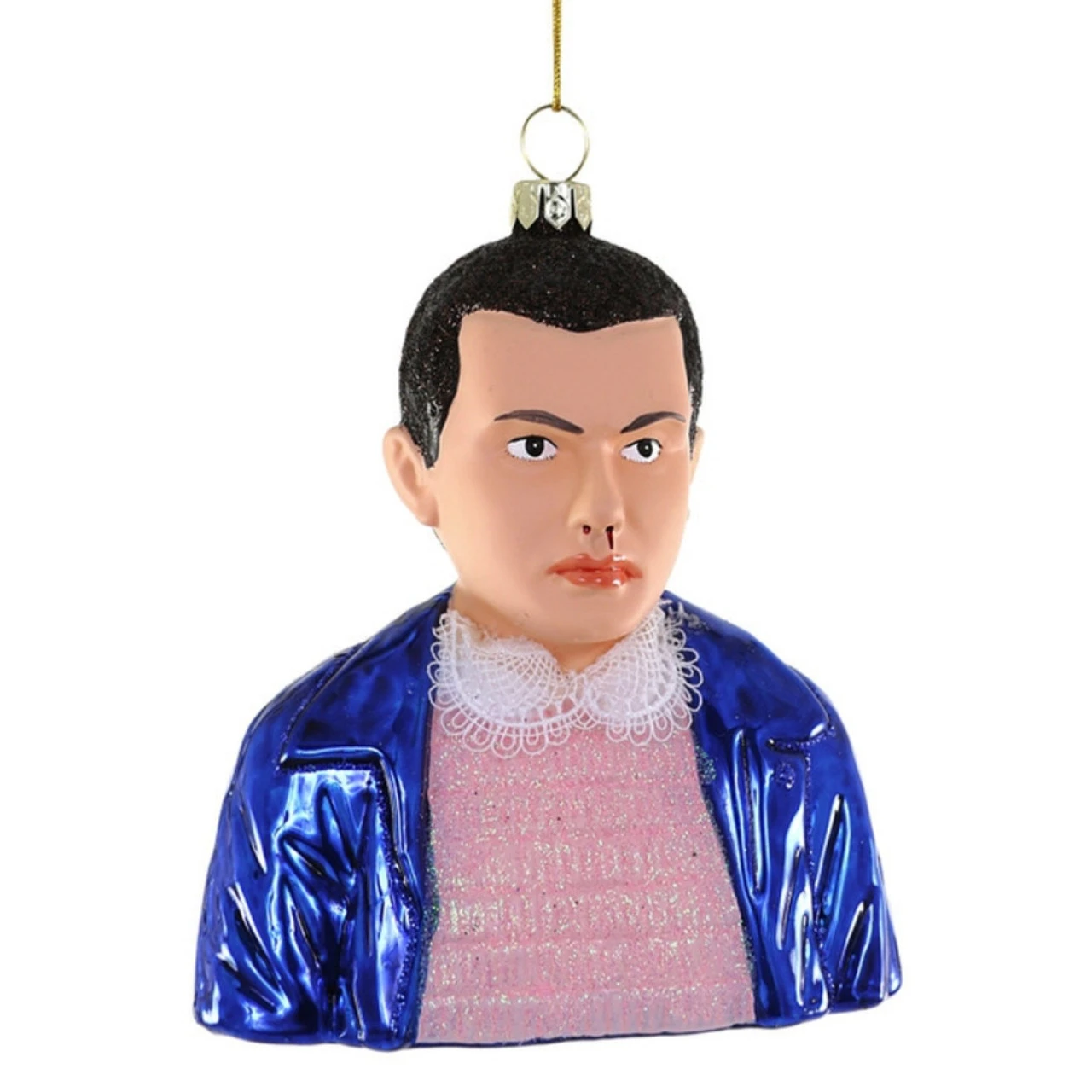 Journey to Hawkins and beyond with the Eleven Christmas Ornament by Cody Foster. Masterfully sculpted from pristine glass, this ornament vividly encapsulates Eleven, the telekinetic protagonist from the globally acclaimed Netflix series, Stranger Things. Perfect for fans of the supernatural drama, it captures Eleven’s distinctive look and fierce spirit. With Cody Foster’s meticulous craftsmanship, this piece promises to be a standout, infusing your holiday decor with a touch of the Upside Down’s mystique. Celebrate the festive season by bringing the charm and courage of Eleven to your Christmas tree.