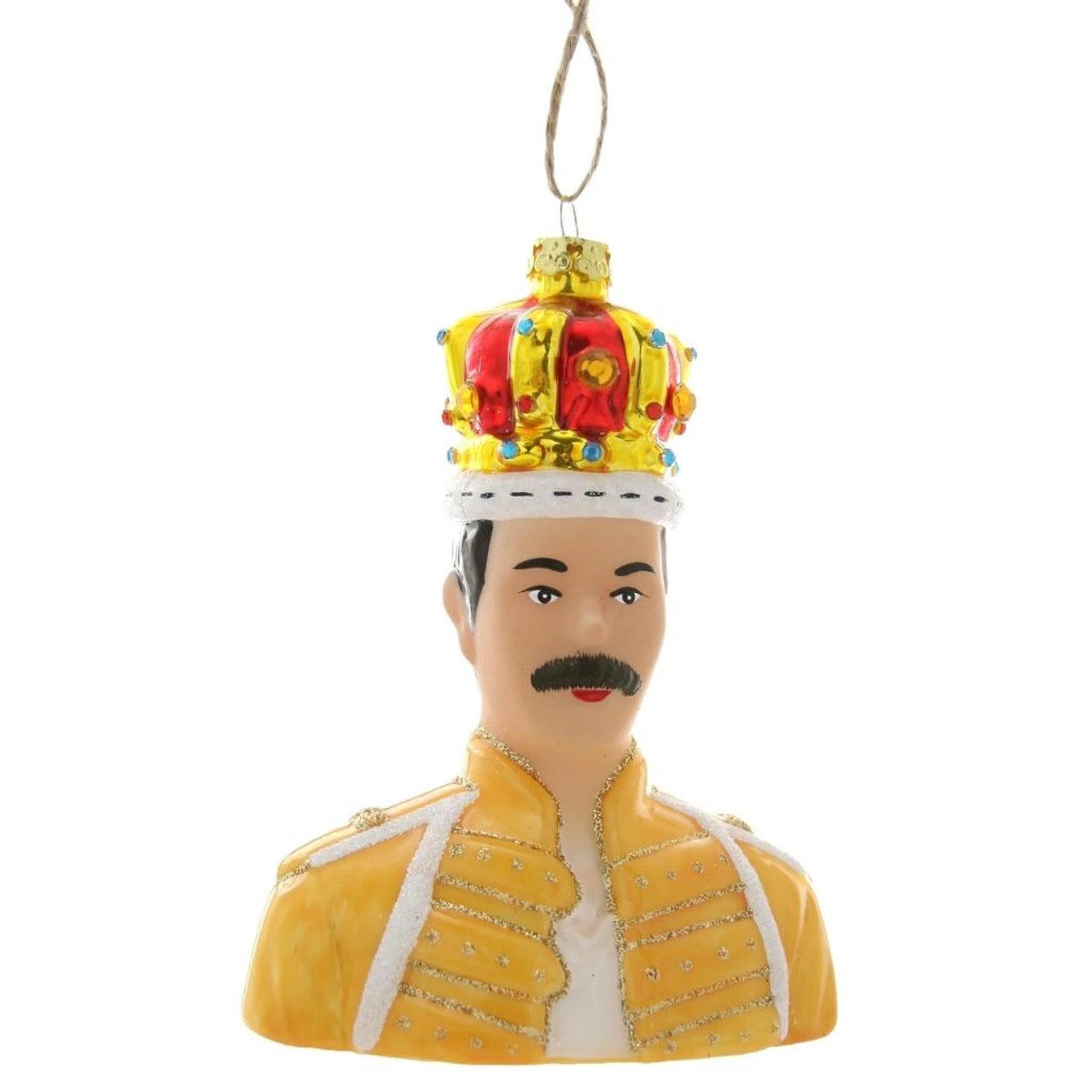 A Cody Foster design. Don’t stop him now! Known for his amazing vocal range especially in his performances of Bohemian Rhapsody, Freddie Mercury was the lead vocalist of Queen and a champion of music. Dressed in the iconic yellow military jacket that he wore in his final tour with the addition of a jeweled and glittering crown, this Freddie Mercury ornament is a great way to remember the man whose music continues to influence the scene even today.