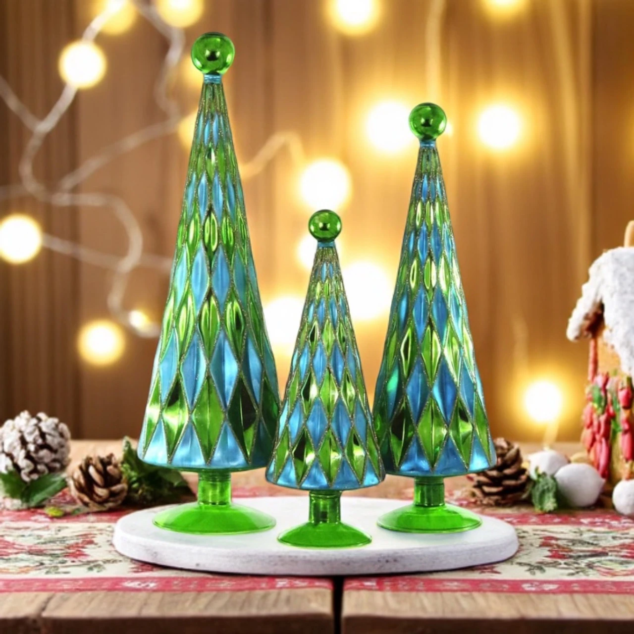 Step into the sparkle of the space age with this trio of Cody Foster Mid Century Diamond Trees! With a bold blue and green diamond pattern, these glossy cone-shaped trees shimmer with retro flair.
