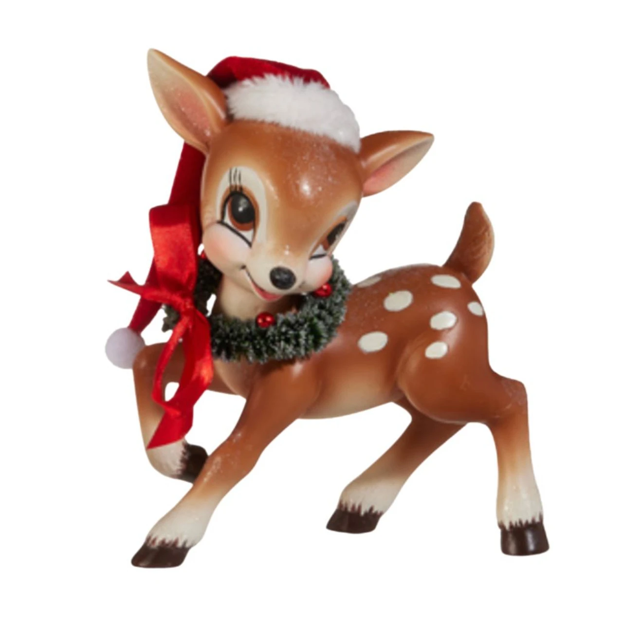 Add a touch of retro charm to your holiday decor with this adorable Cutesy Deer with Wreath figurine! Dressed in a festive Santa hat and a lush green wreath adorned with red berries, this sweet little deer is ready to prance into your Christmas collection.