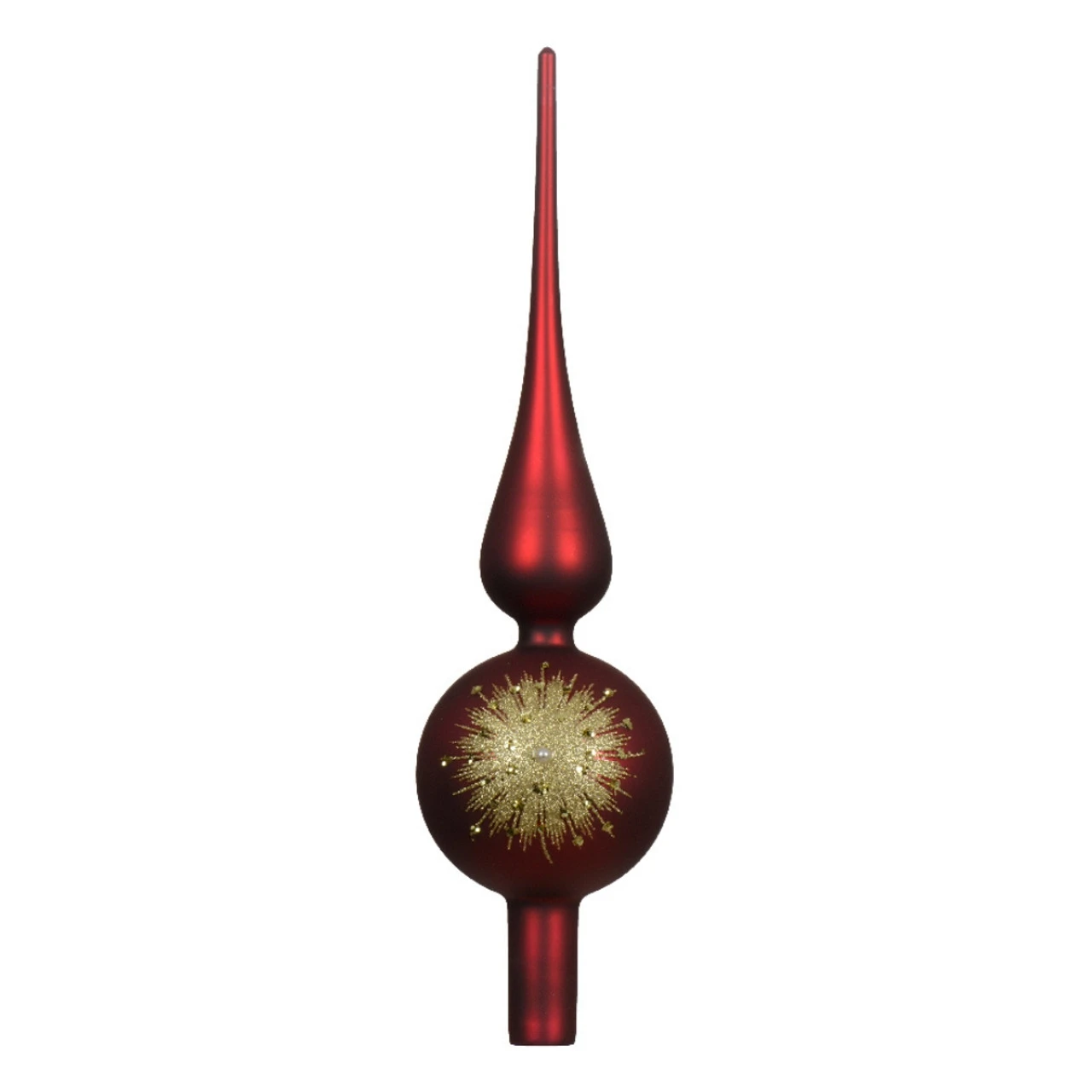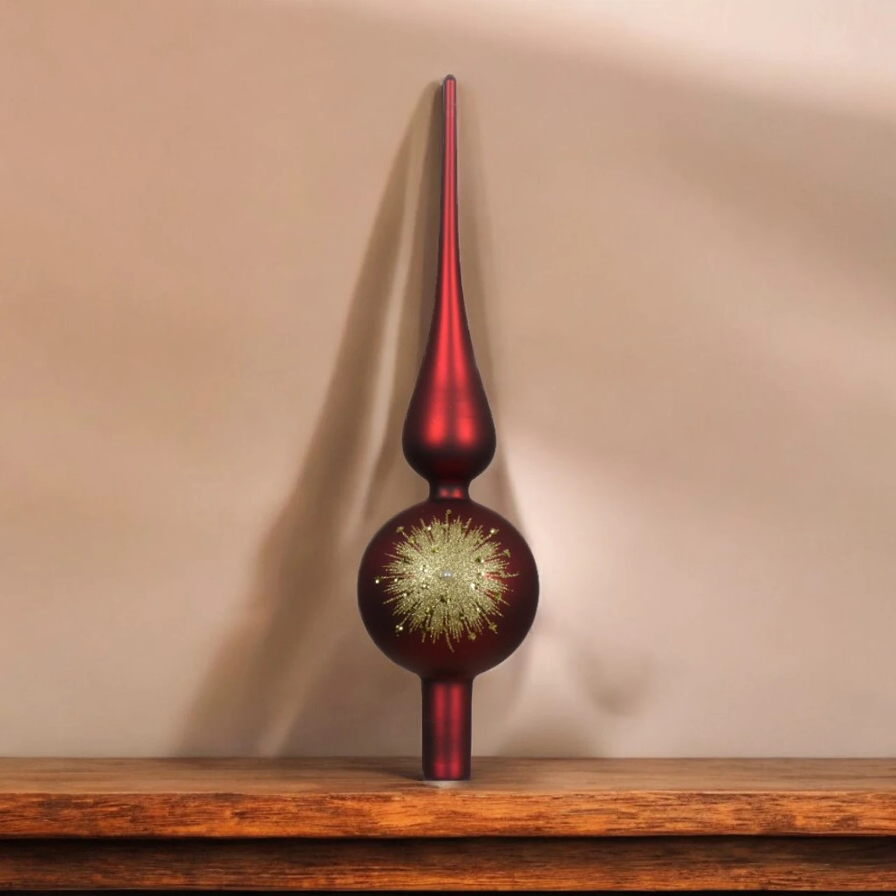 Elevate your holiday decor with this stunning Dark Red Glass Finial Tree Topper. Standing at 12.2 inches tall, this elegant piece is crafted from high-quality glass and adorned with glitter for a sparkling finish. Its versatile design allows it to be used as a tree topper or displayed on a shelf or tabletop. The intricate details and deep red hue make it a timeless addition to your festive decorations.