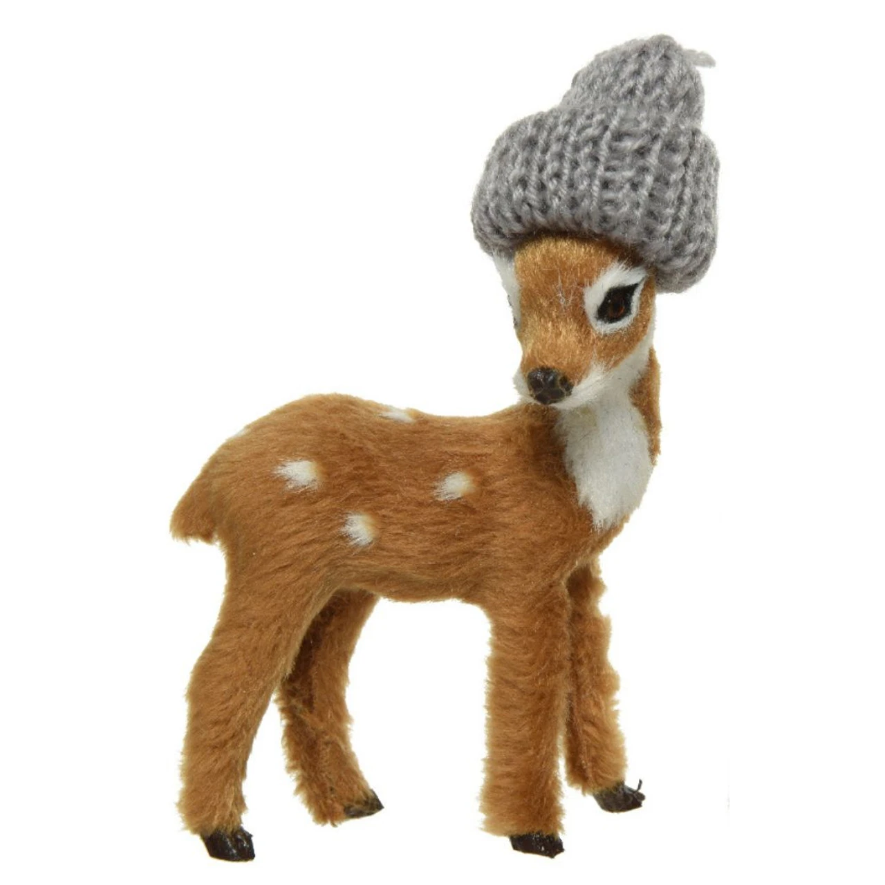 This young deer is staying warm (and stylish) in a grey knit cap.