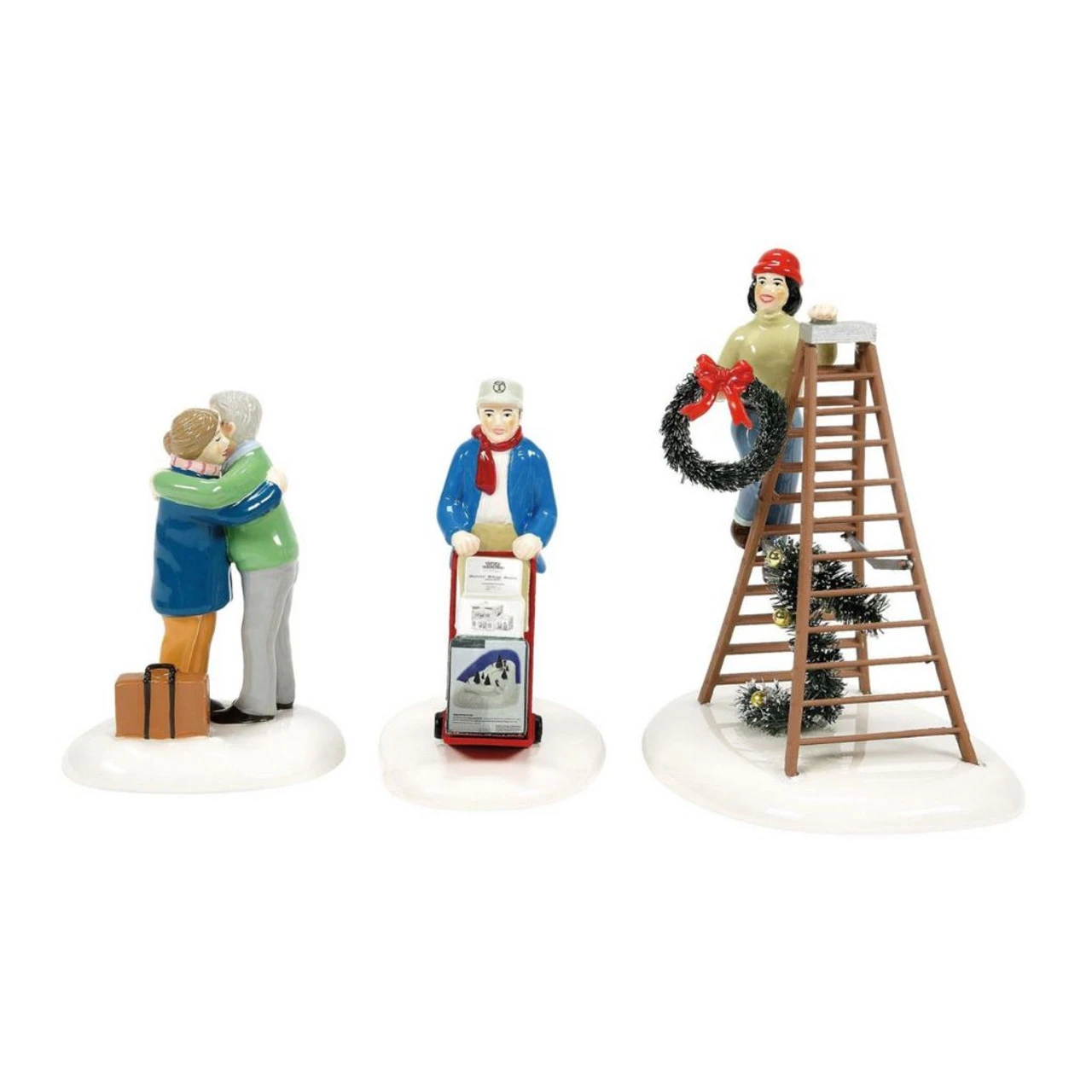 Celebrate community spirit with the Friends & Neighbors set from Department 56 Snow Village. This charming trio features heartwarming scenes: a warm embrace, a friendly delivery driver, and a neighbor decorating with festive cheer.