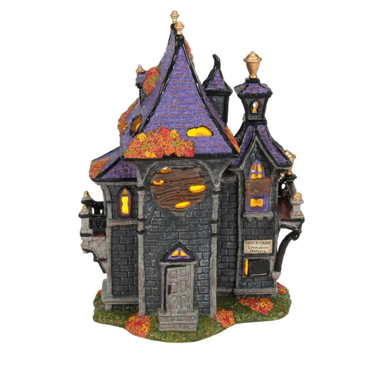 Add a spooky charm to your Halloween Village with the Department 56 Puckett’s Funerarium. This haunted funeral home features eerie glowing windows, creepy skull accents, and vibrant autumn details, creating a perfect centerpiece for your display.