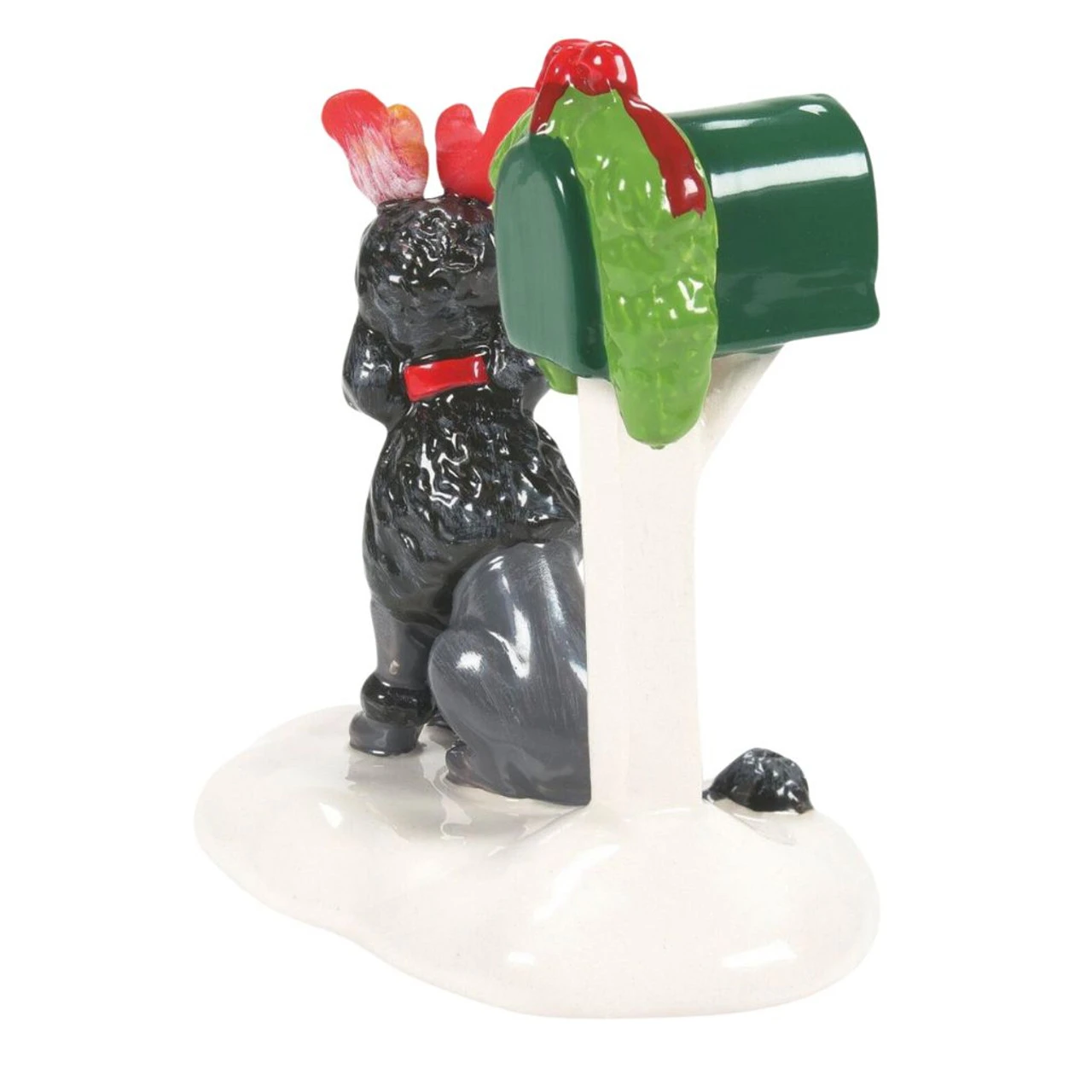 Add a touch of whimsy to your holiday village with The Warmest Nest Around accessory from Department 56 Snow Village. This adorable scene features a cheerful poodle sitting near a festive mailbox, with a pair of cardinals perched on its head.