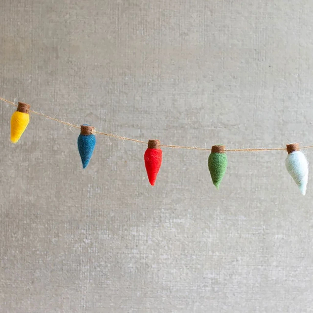 Brighten up your holiday decor with this Felt Christmas Light Bulb Garland! Featuring colorful felt light bulbs strung on a natural jute cord, this handcrafted garland adds a playful and festive charm to any setting.