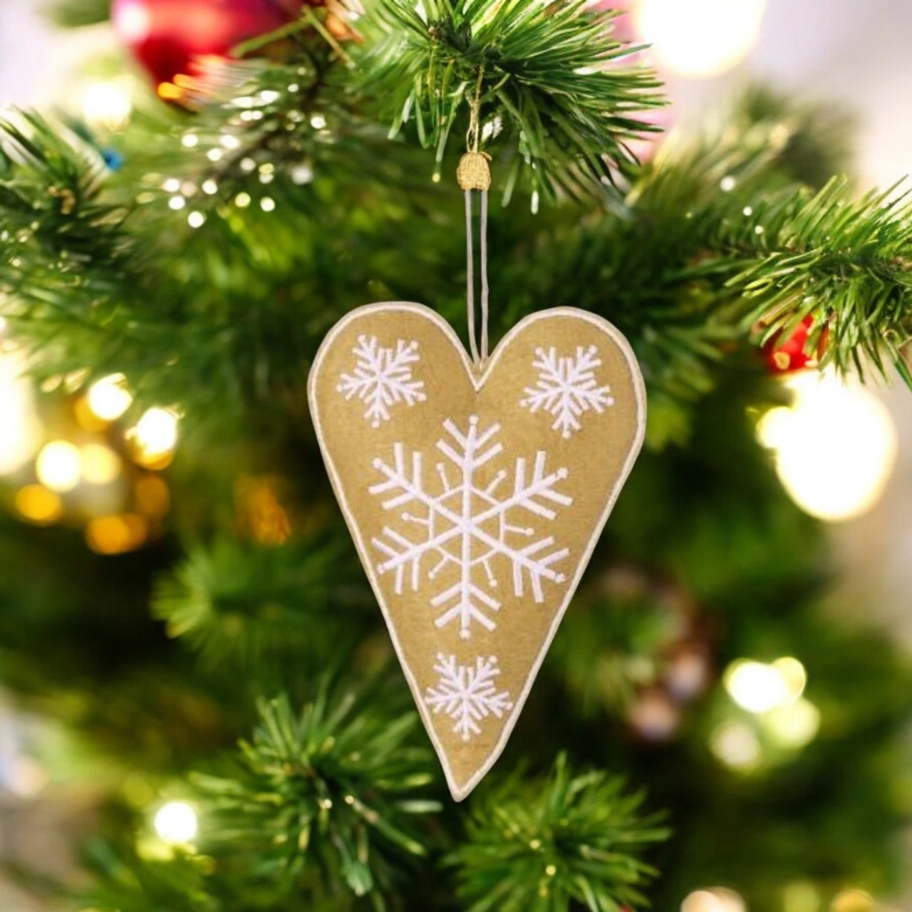 Add a cozy, Scandinavian touch to your holiday decor with this Felt Embroidered Heart Ornament. Featuring a charming heart shape and intricate white snowflake embroidery, this soft felt ornament brings warmth and elegance to your Christmas tree.