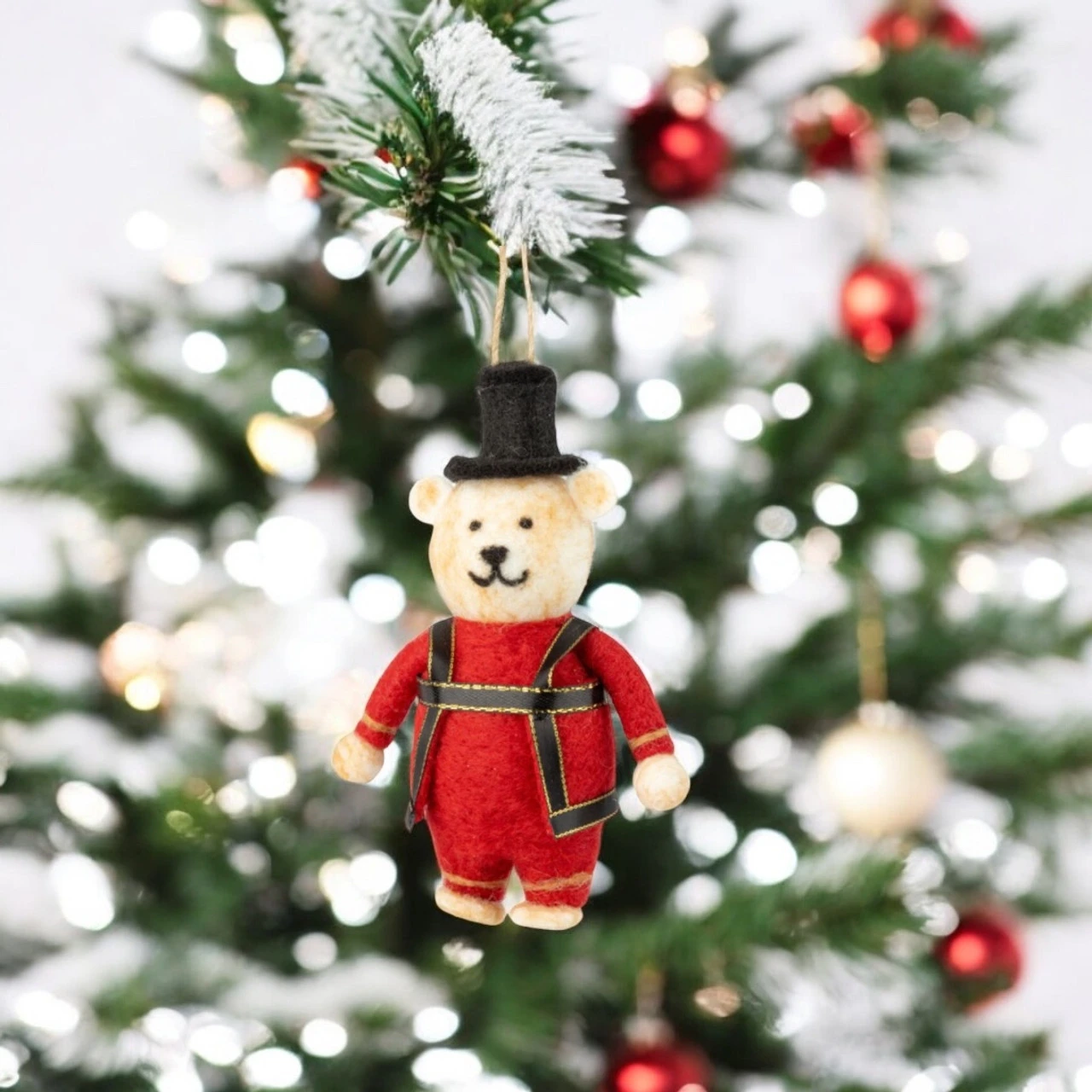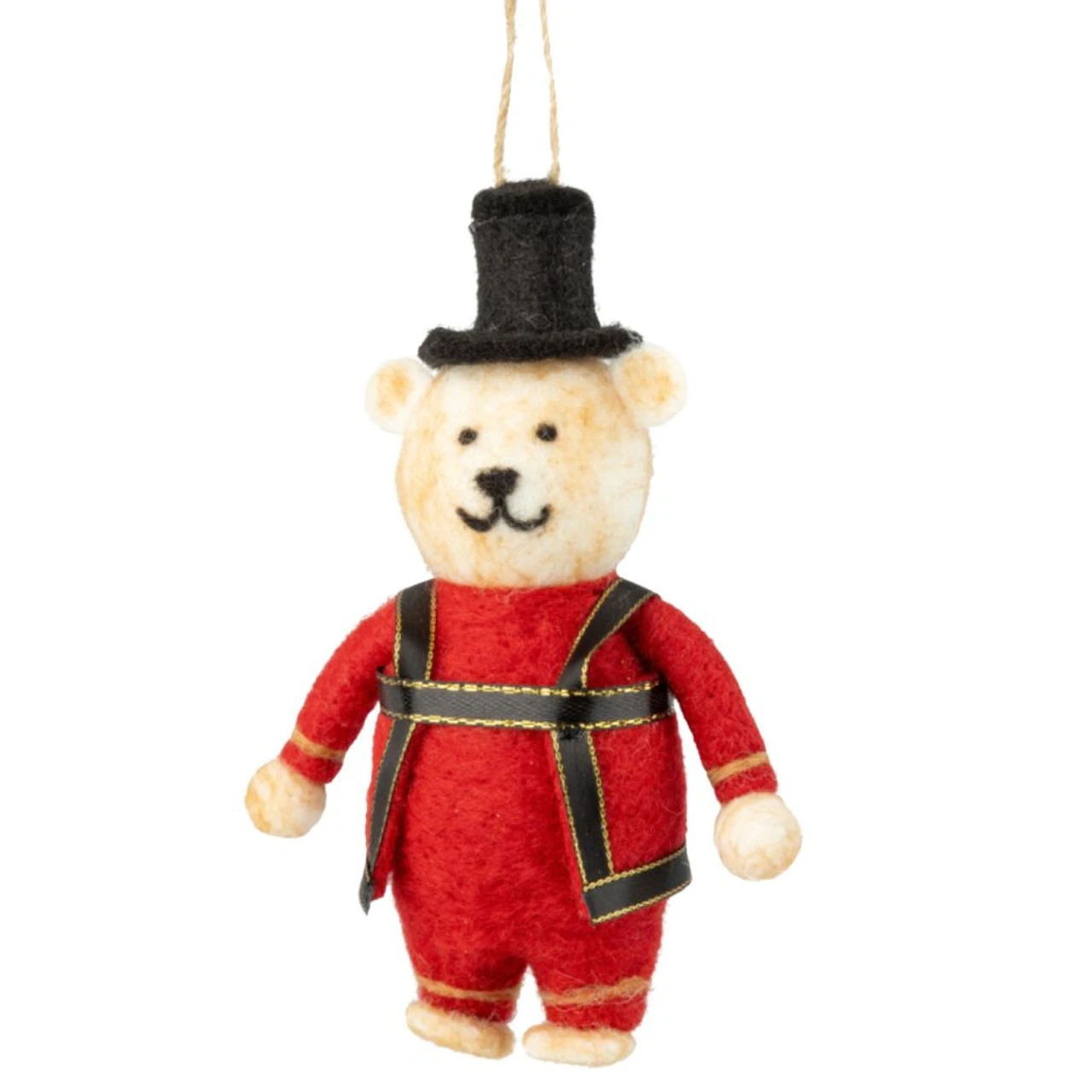 Bring a touch of royal charm to your tree with this Felt King’s Guard Bear Ornament! Dressed in a regal red sweater, black accents, and a classic top hat, this bear embodies festive elegance.