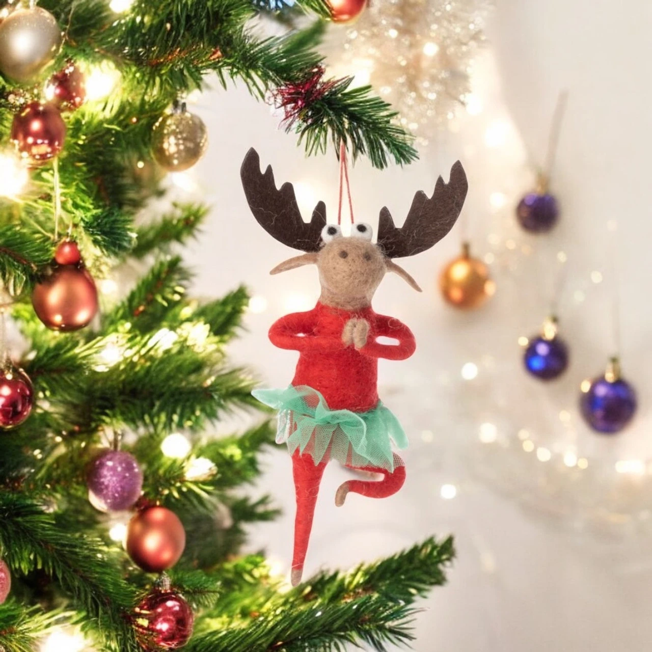Add a playful twist to your holiday decor with this Felt Moose Yoga Pose Ornament! This whimsical moose features a bright red top, a green tutu, and is striking a classic yoga pose.