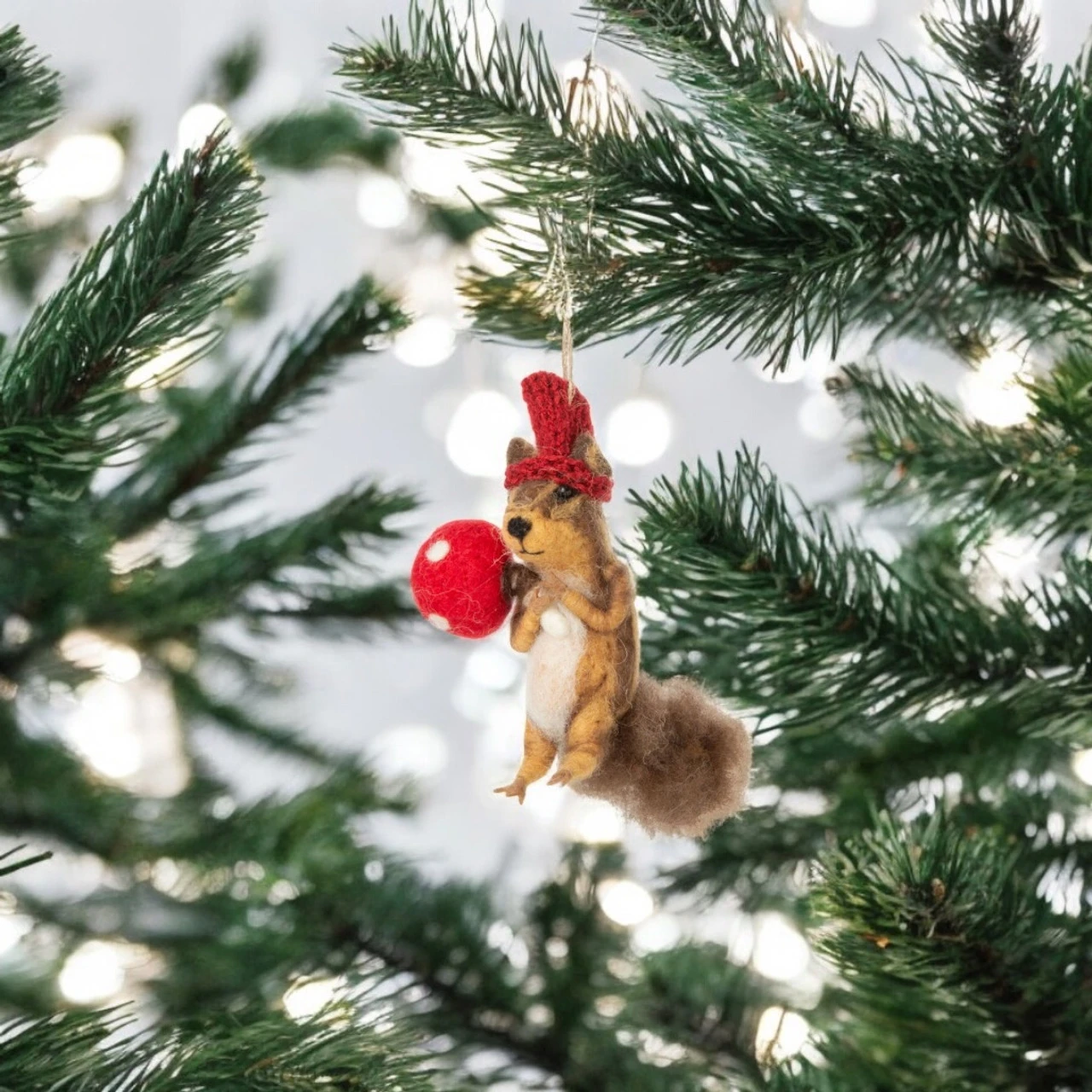 Add a whimsical touch to your holiday decor with this Felt Squirrel with Mushroom Ornament. Featuring a playful squirrel holding a bright red mushroom, this handmade treasure showcases intricate detailing and a cozy, woodland-inspired vibe.