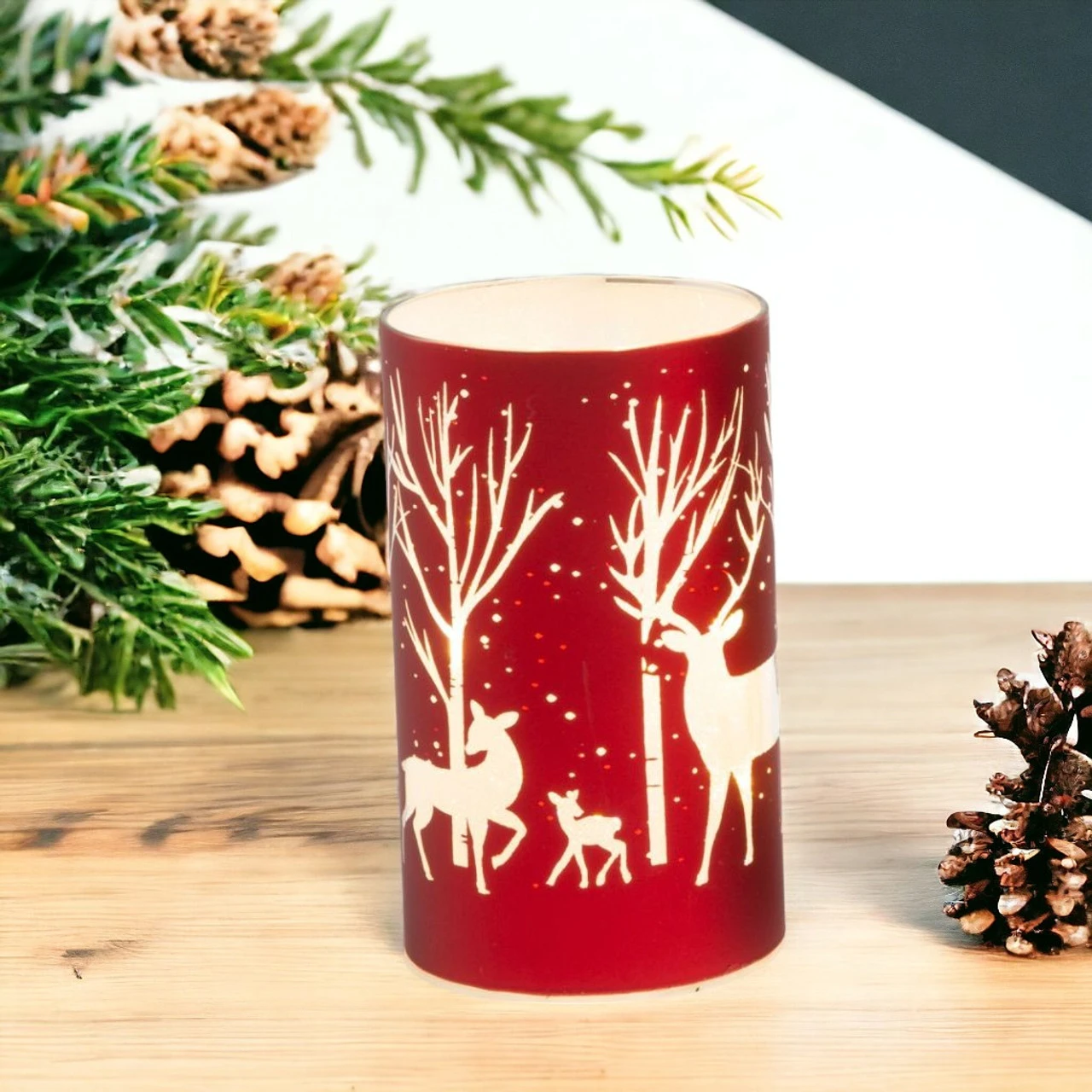 Bring the magic of the holidays to your home with our Festive Reindeer Glass Luminary. This enchanting small-sized luminary casts a warm glow, illuminating silhouetted reindeer and serene winter trees. Ideal for cozy evenings, this luminary adds a touch of festive cheer to any room.