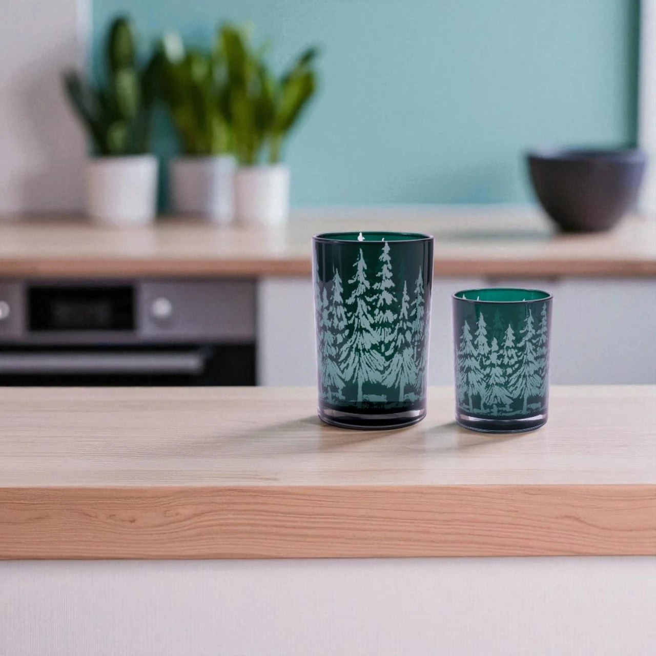 Add woodland elegance to your décor with this Forest Design Glass Candle Holder Set. This set includes two sizes—5 inches and 7 inches tall—crafted from sleek green glass with a frosted evergreen tree design for a cozy, wintry feel.