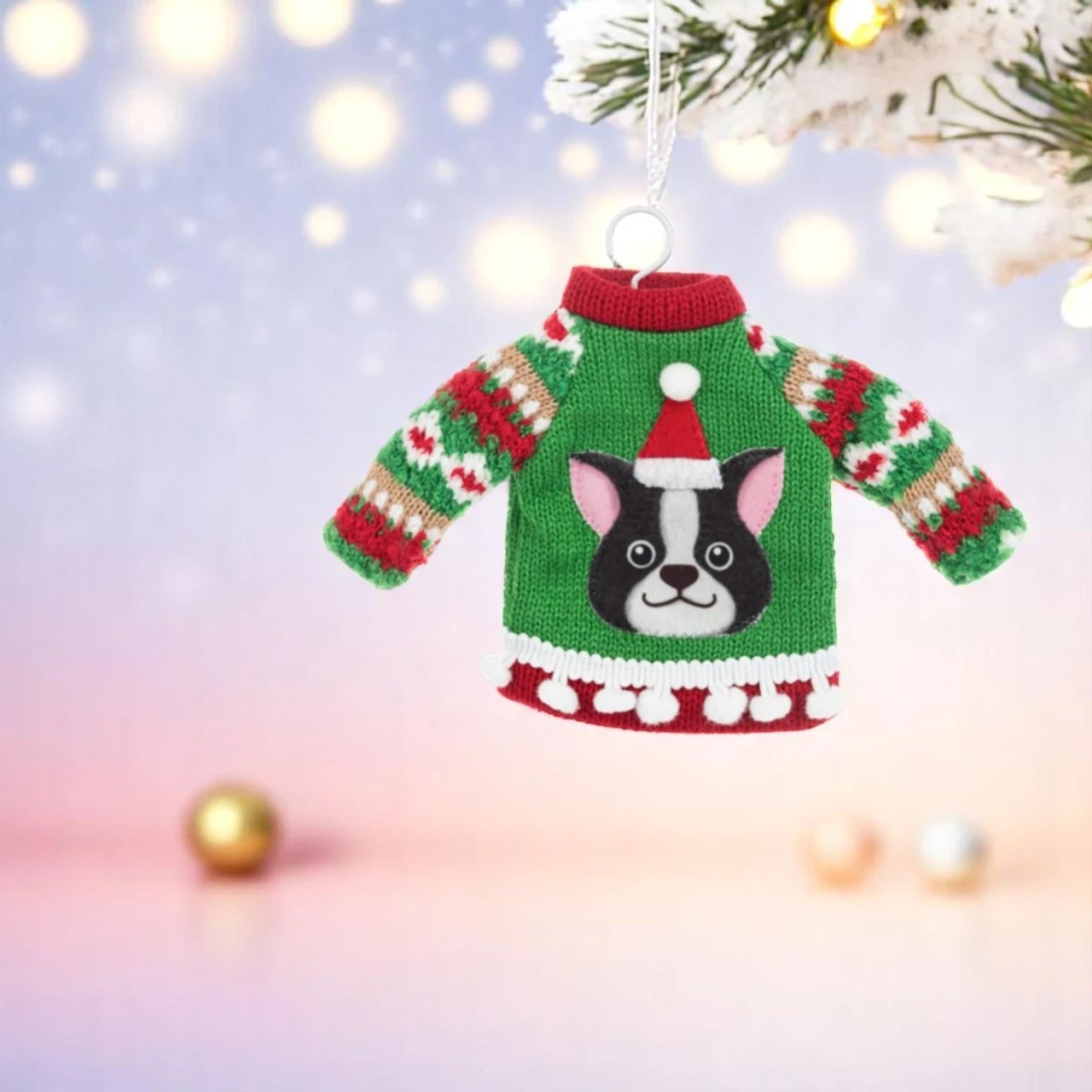 Dress your tree in cozy holiday charm with our Frenchie Holiday Sweater Ornament! This playful piece features a festive green knit design, detailed patterned sleeves, and a cheerful French Bulldog wearing a Santa hat.