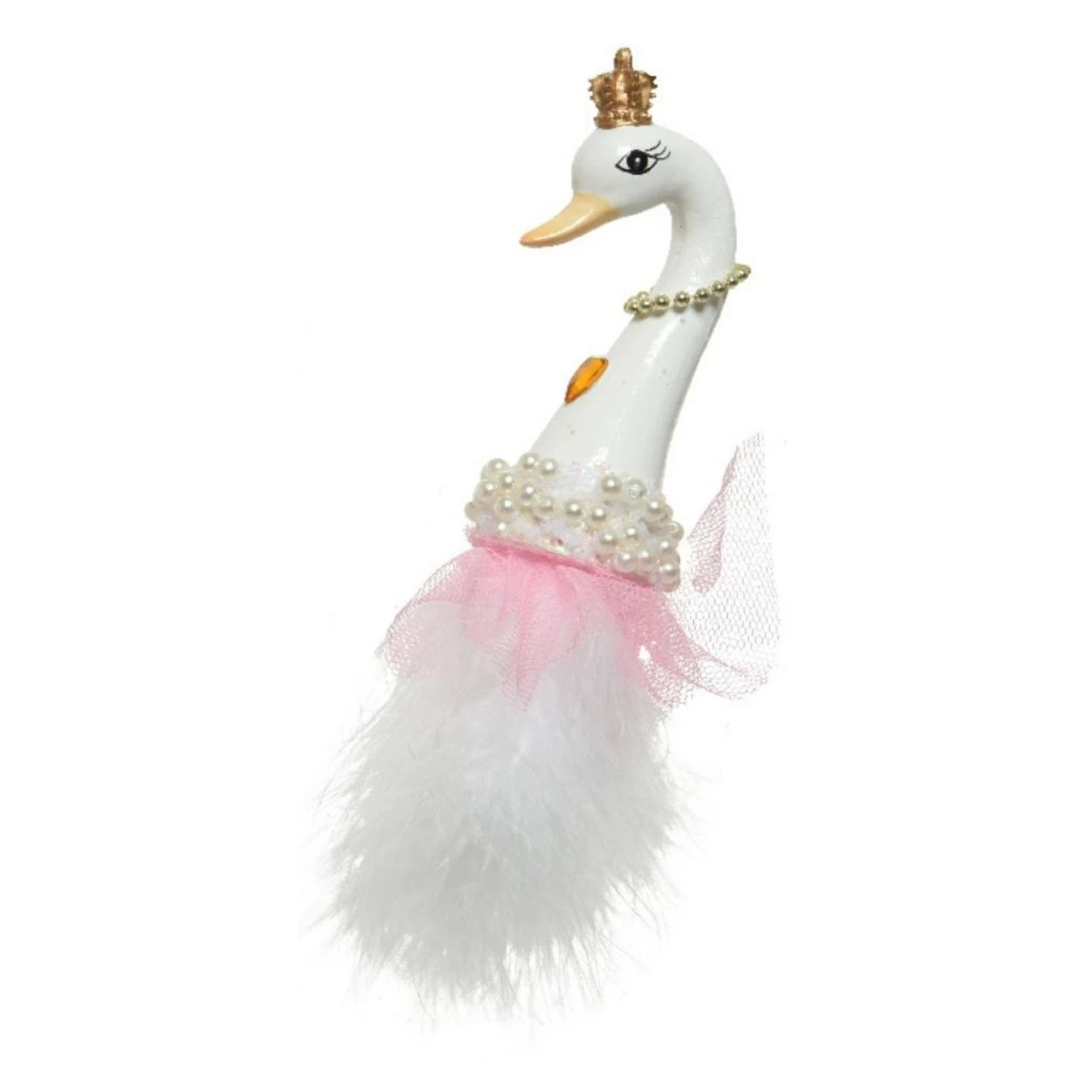 Step into a world of elegance with our hand-blown glass ballerina swan ornament, a true testament to artisanal beauty. Delicately crafted, the swan graces its surroundings with a plush fur tutu, embodying grace and serenity. Every detail, from the curve of its neck to the texture of the tutu, showcases unparalleled craftsmanship. This enchanting ballerina swan is not just an ornament but a timeless piece of festive artistry.
