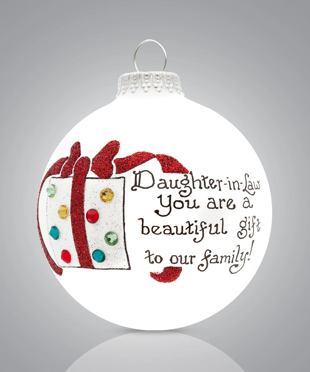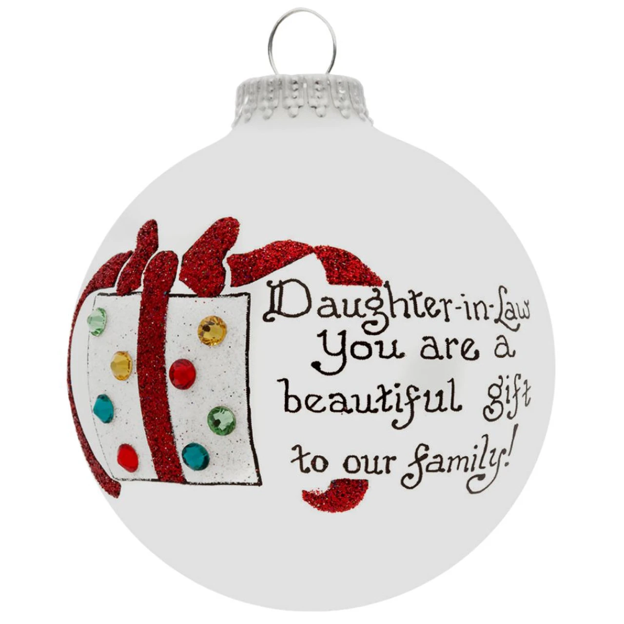Daughter in Law Ornament by All American company Heart Gifts by Teresa, this Hand Painted Glass Ornament is especially designed for Daughter in Laws, and proudly source all decorative materials used from American companies – this wonderful glass ornament is inscribed with: