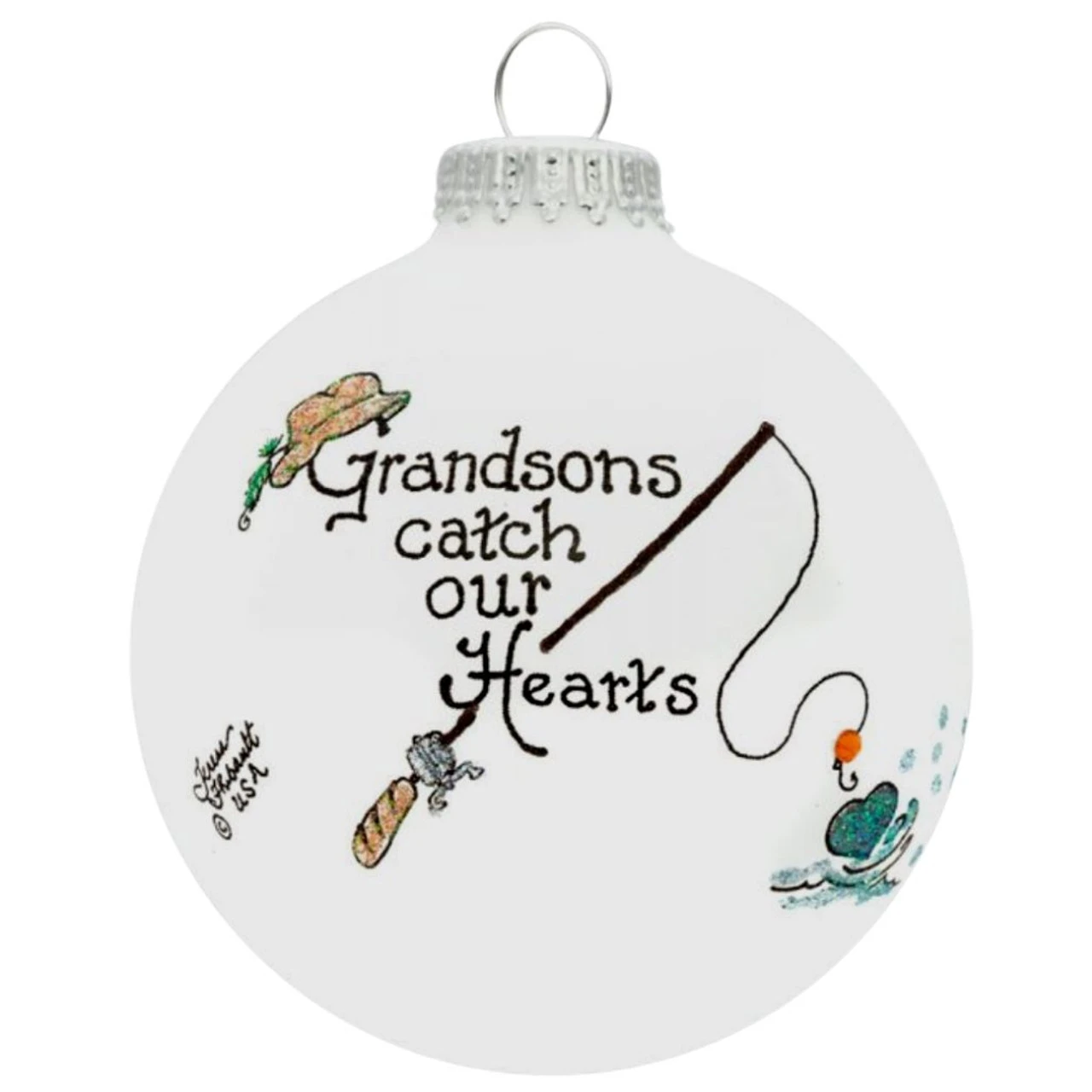 Grandson Fishing Ornament by All American company Heart Gifts by Teresa, this Hand Painted Glass Ornament is especially designed for the love of Grandsons, and proudly source all decorative materials used from American companies – this wonderful glass ornament is inscribed with:
