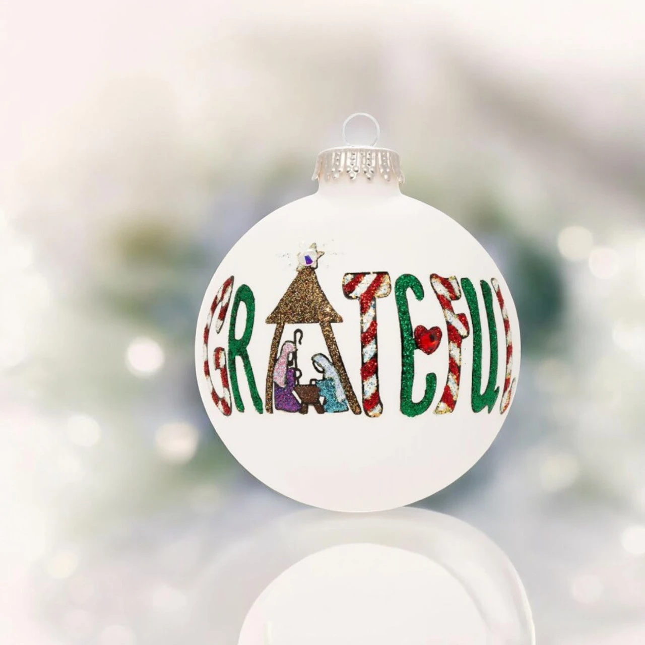 Celebrate gratitude and the true spirit of Christmas with the Heart Gifts by Teresa “Grateful” ornament. This 3.5” glass ball is hand-painted with vibrant holiday colors, depicting a charming Nativity scene within the word “Grateful,” accented with Swarovski crystals for an extra sparkle. Made with love in North Carolina, this ornament beautifully captures the essence of thankfulness, faith, and family. A perfect keepsake to treasure or gift to someone special.