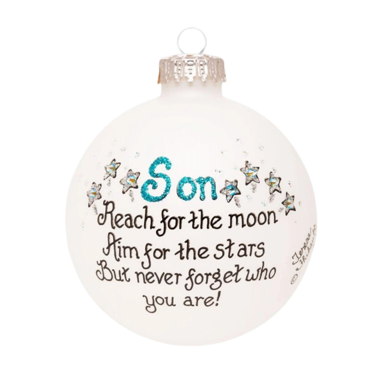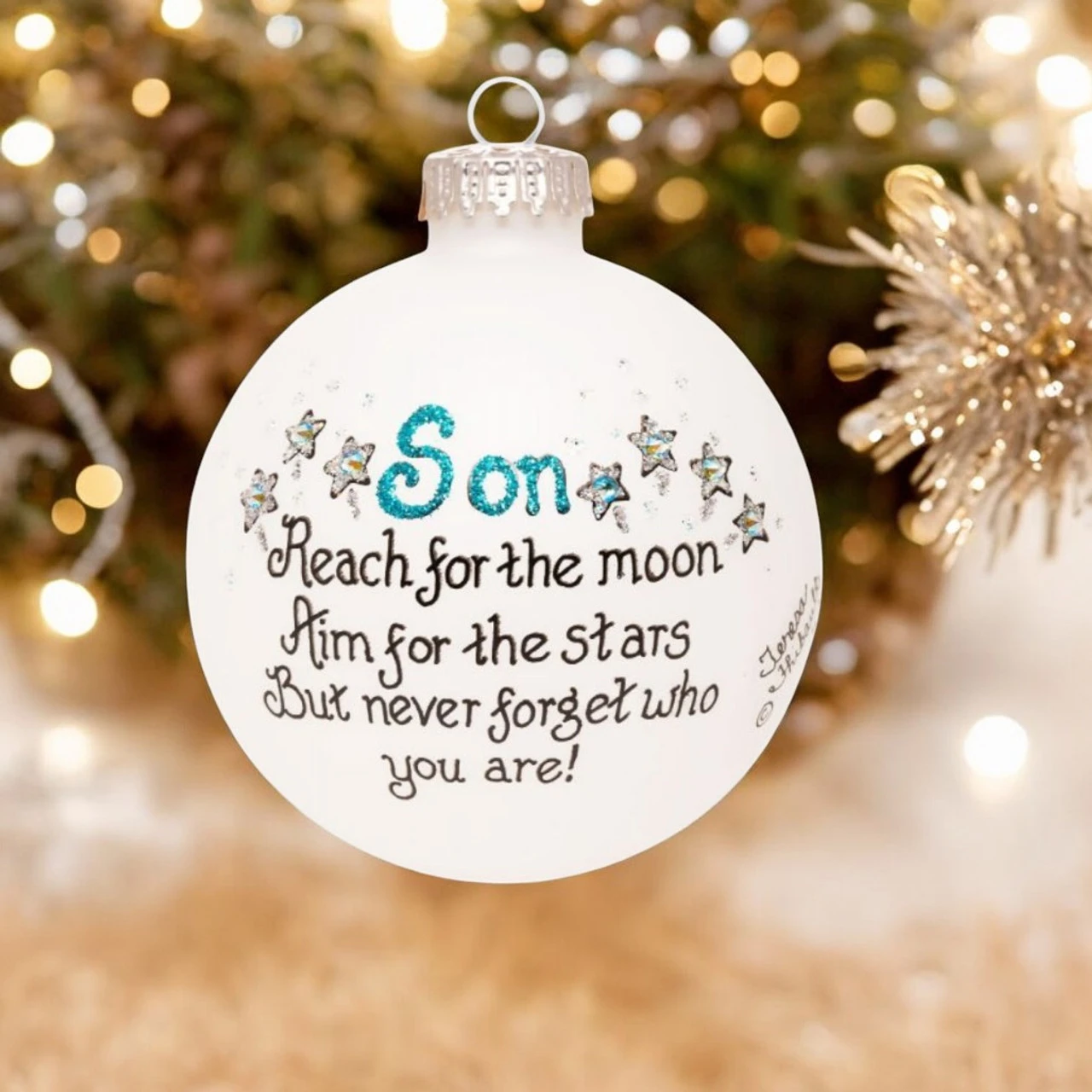 Inspire your son with the Heart Gifts Son Moon and Star Ornament, featuring the message “Reach for the moon, aim for the stars, but never forget who you are.” This hand-painted ornament sparkles with glitter and Swarovski crystal accents, reminding him of your love and support. Made in North Carolina, this meaningful keepsake is perfect for Christmas or any occasion celebrating his unique journey.