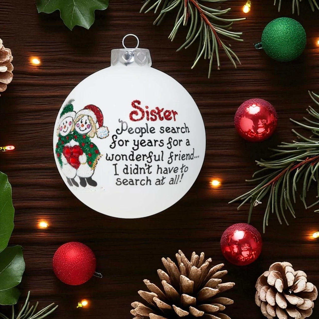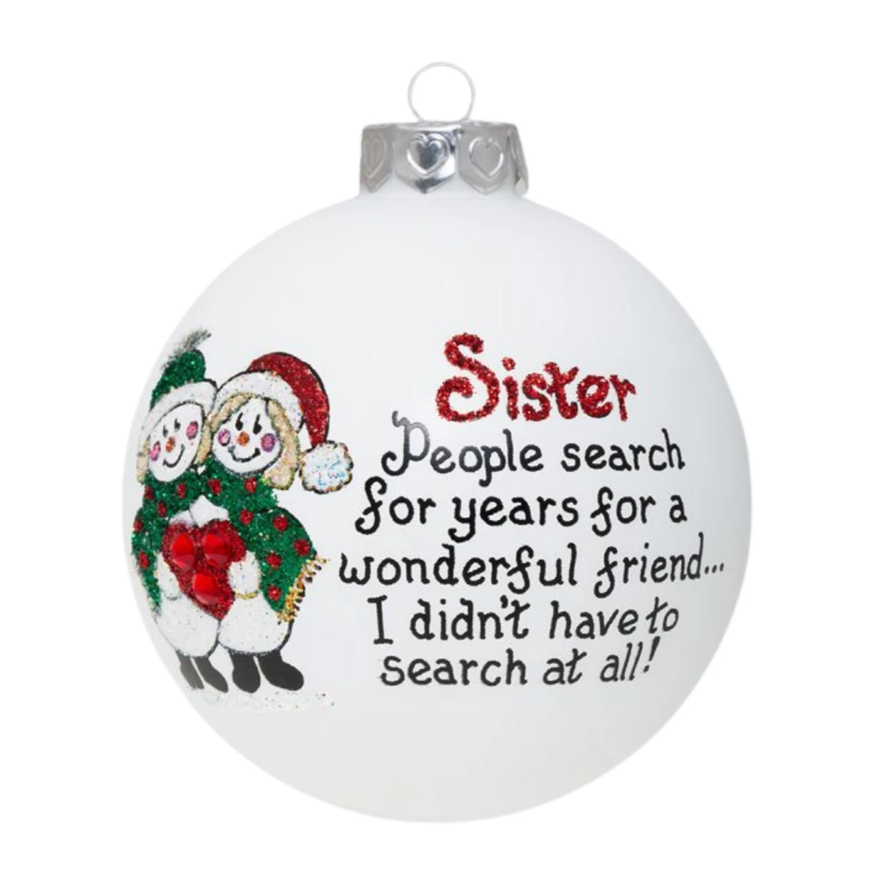 Celebrate the special bond of sisterhood with the Heart Gifts “Sister Snowman” Ornament. Featuring the sweet sentiment, “Sister, people search for years for a wonderful friend… I didn’t have to search at all!” and a charming snowman design, this 3.5-inch glass ornament sparkles with glitter and Swarovski crystals.