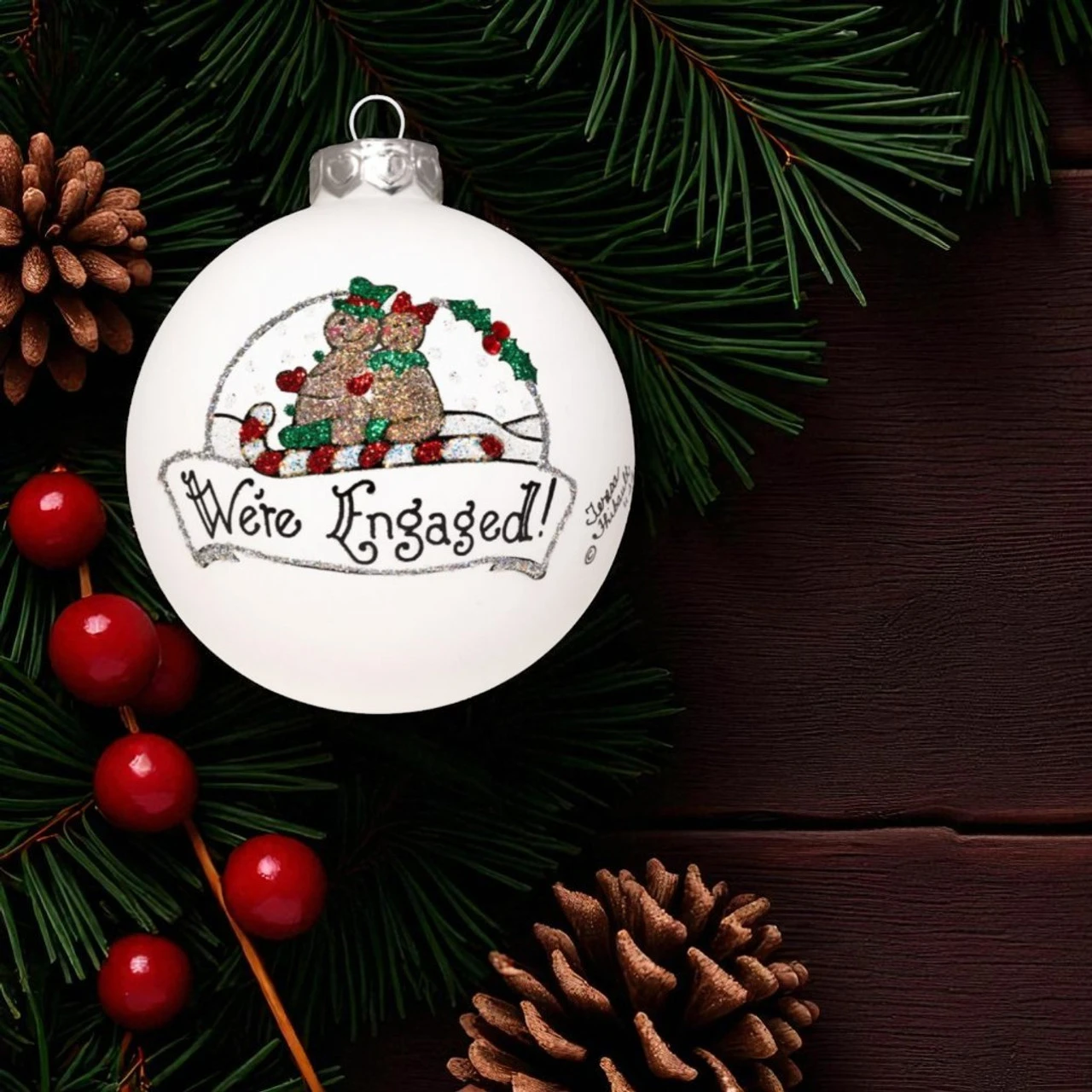 Celebrate the joyous occasion of your engagement with the Heart Gifts “We’re Engaged” Ornament. Featuring two glittery bears sitting together under festive holly, this design proudly declares “We’re Engaged!” in elegant script.