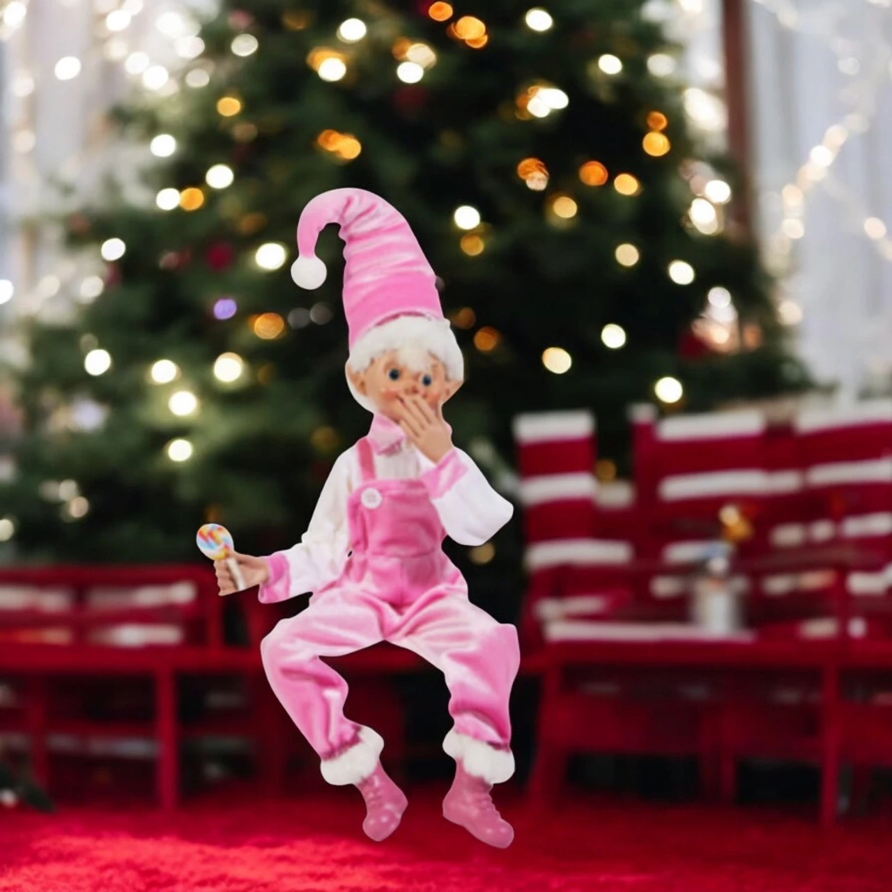 Add a playful pop of pink to your holiday decor with this Jolly Posable Elf! Dressed in soft pink overalls, a matching hat, and fluffy white trim, this mischievous elf is ready for festive fun. Holding a colorful lollipop, he brings a whimsical charm to Christmas displays.