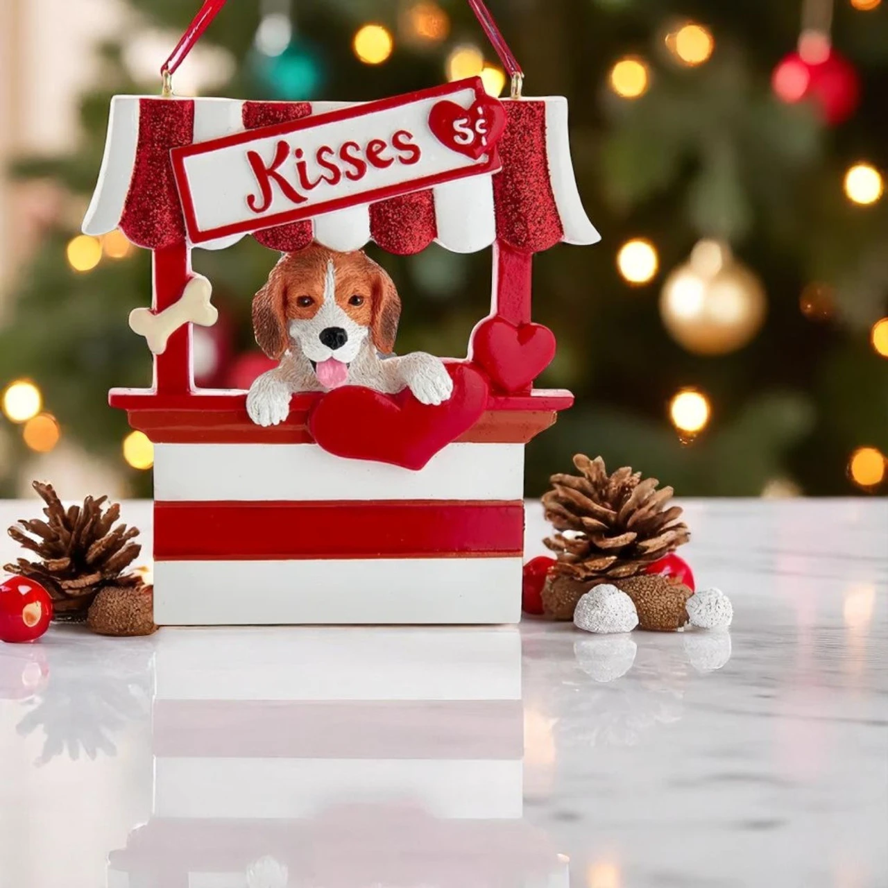This Beagle Kissing Booth Personalized Ornament is pure holiday joy! Measuring 4 inches tall and made of resin, it stars an adorable beagle ready to dish out kisses from a festive red-and-white booth.