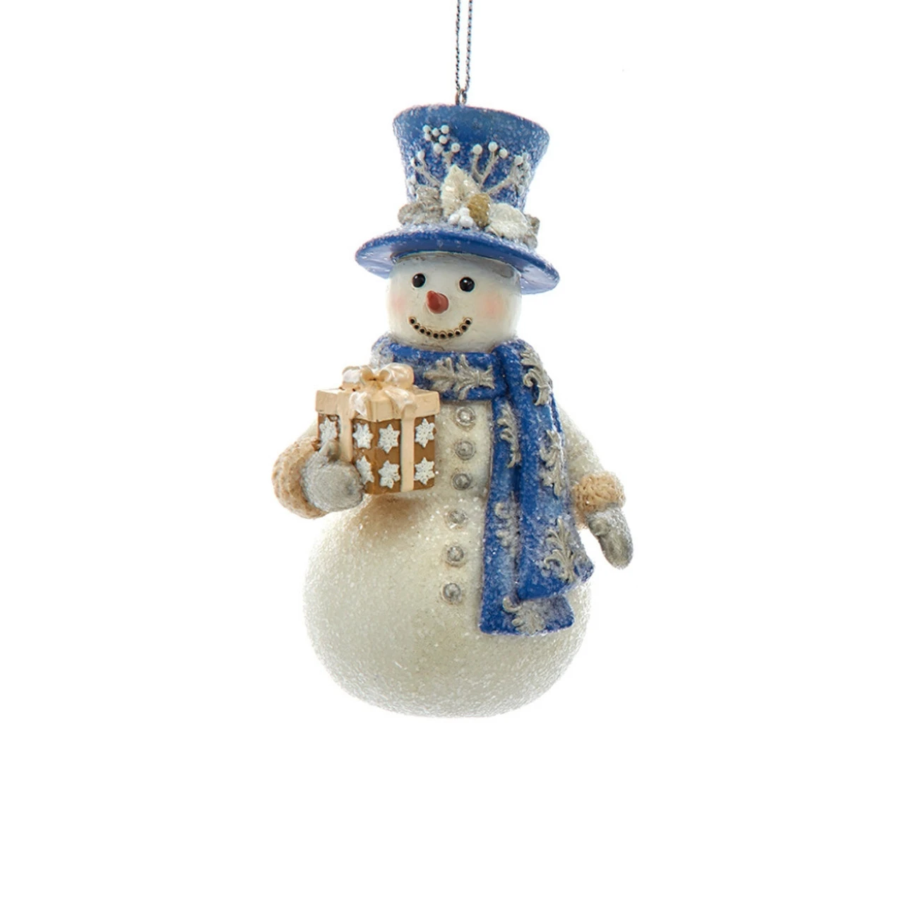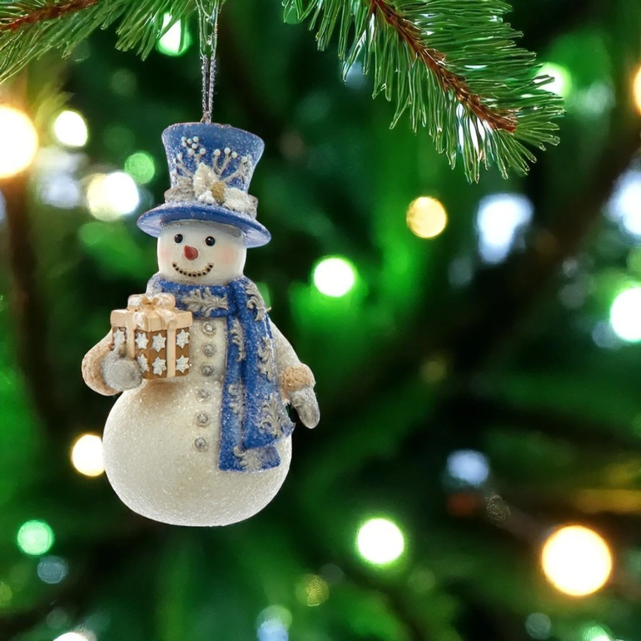 Dressed to dazzle in icy blue and shimmering platinum, this cheerful snowman arrives bearing a glittering gift and contagious holiday cheer. Frosted resin gives his rounded body sugary sparkle, while a tall top hat, cozy scarf, and pearly buttons add fashionable flourish.