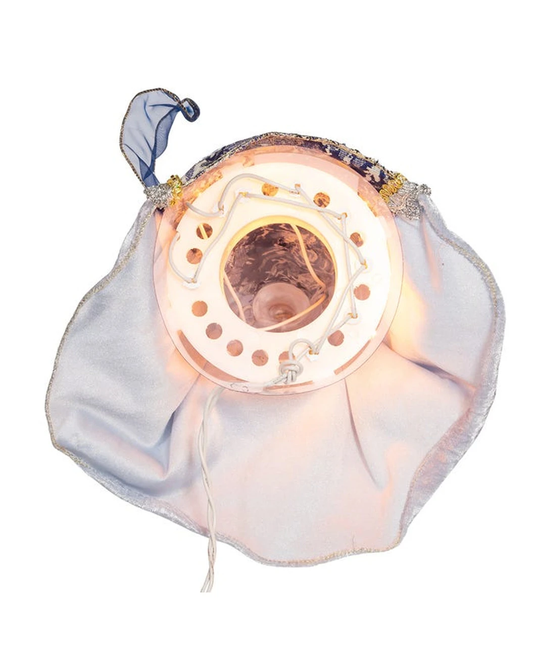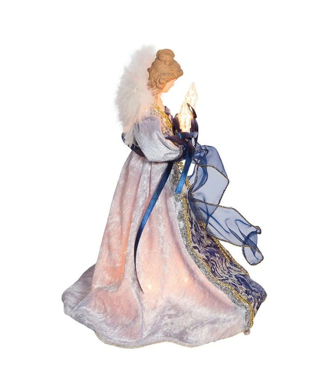 This Kurt Adler blue with gold trim angel treetop is a beautiful, classic way to accent the lighting and decor of your Christmas tree. With long, painted brown hair, this angel is wearing an intricately designed blue gown and white gown with gold trim and white feathered wings. It is illuminated by the lights within and in the star-shaped candles, she is carrying.