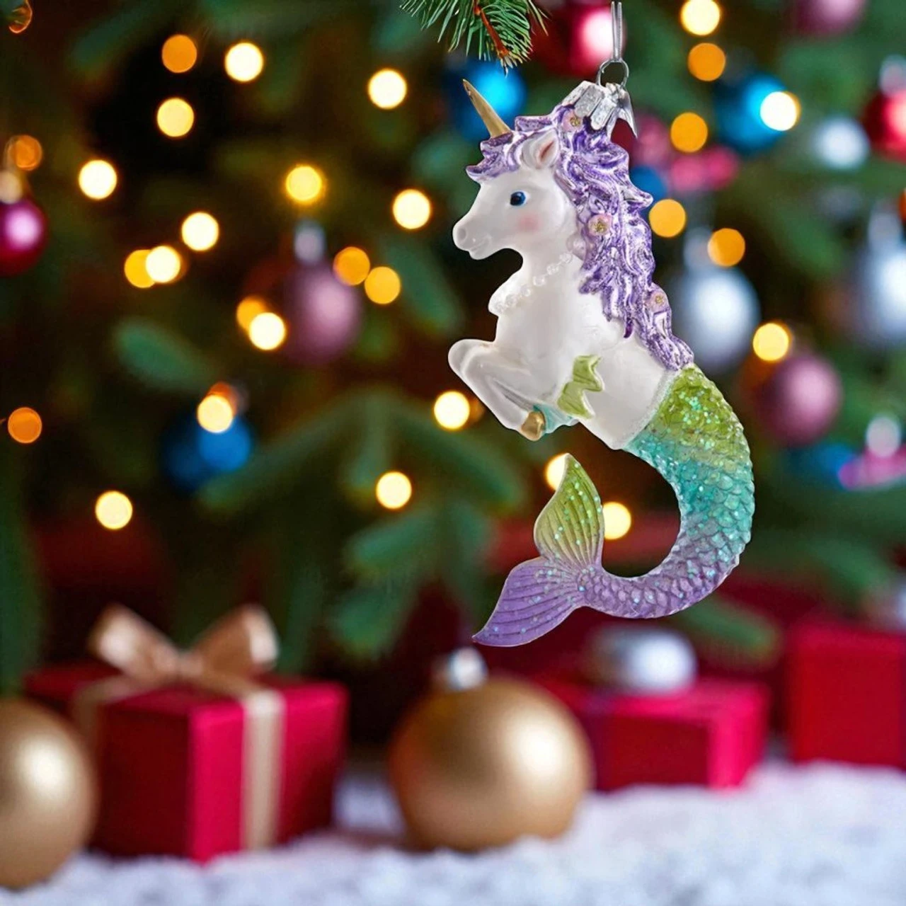 Handcrafted from quality glass, it dazzles with whimsical detail and a hint of sparkle. Whether you’re a fantasy lover or just love quirky ornaments, this mercorn makes a whimsical splash in any holiday setup.