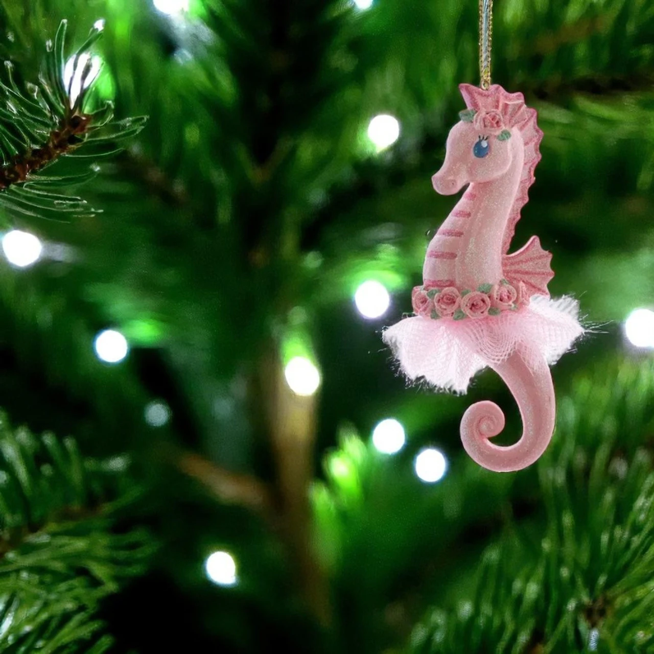 Make waves this holiday season with the Pink Ballerina Seahorse Ornament from Kurt Adler! This adorable seahorse is dressed in a sparkly pink tutu with a garland of delicate roses and matching glittery accents.