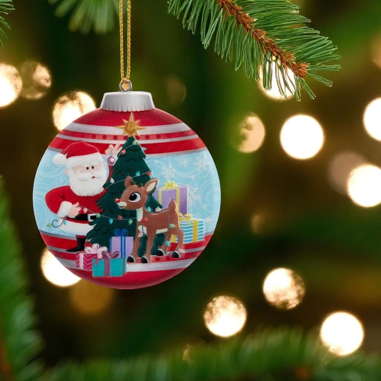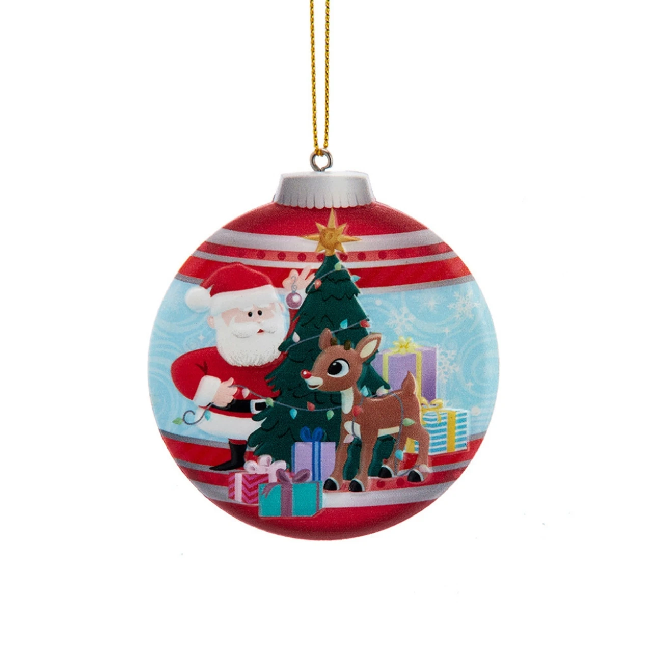 Bring holiday nostalgia to your tree with this 3″ Rudolph and Santa Double-Sided Ornament by Kurt Adler. One side features jolly Santa decorating a tree with Rudolph, while the reverse includes Hermey and friends in festive cheer. Brightly colored and made of durable plastic, this ornament is lightweight and easy to hang.