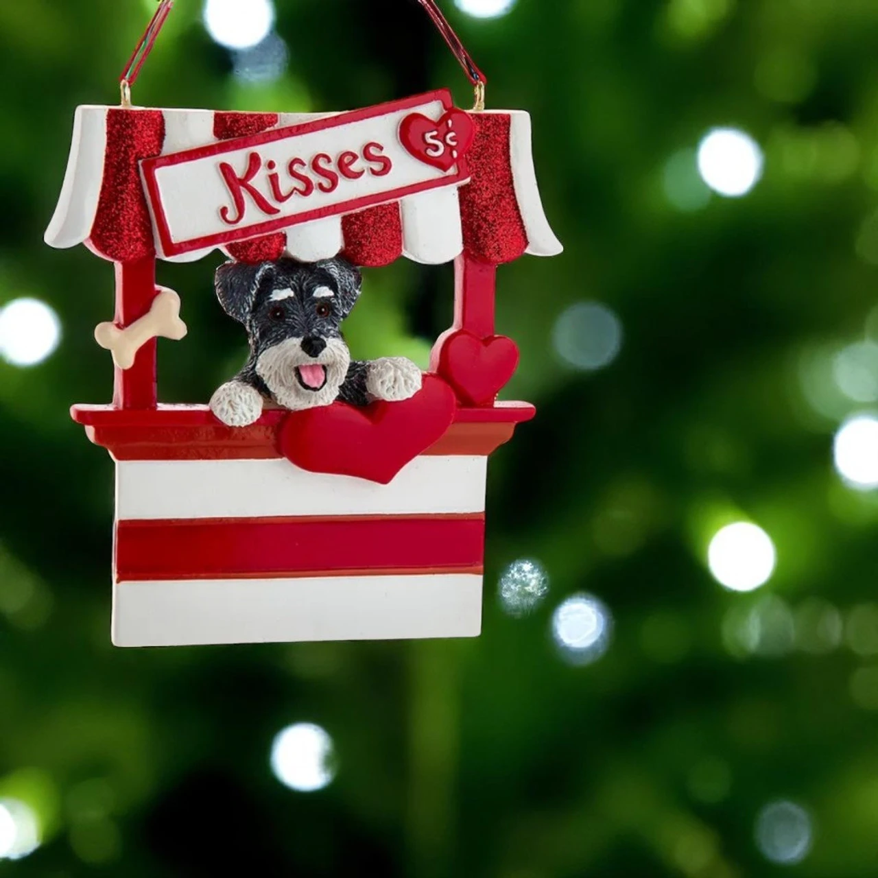 This charming Schnauzer is ready to steal hearts—and maybe a kiss or two! Made from durable resin and standing 4 inches tall, this personalized ornament features a lovable Schnauzer popping out of a red-and-white kissing booth.