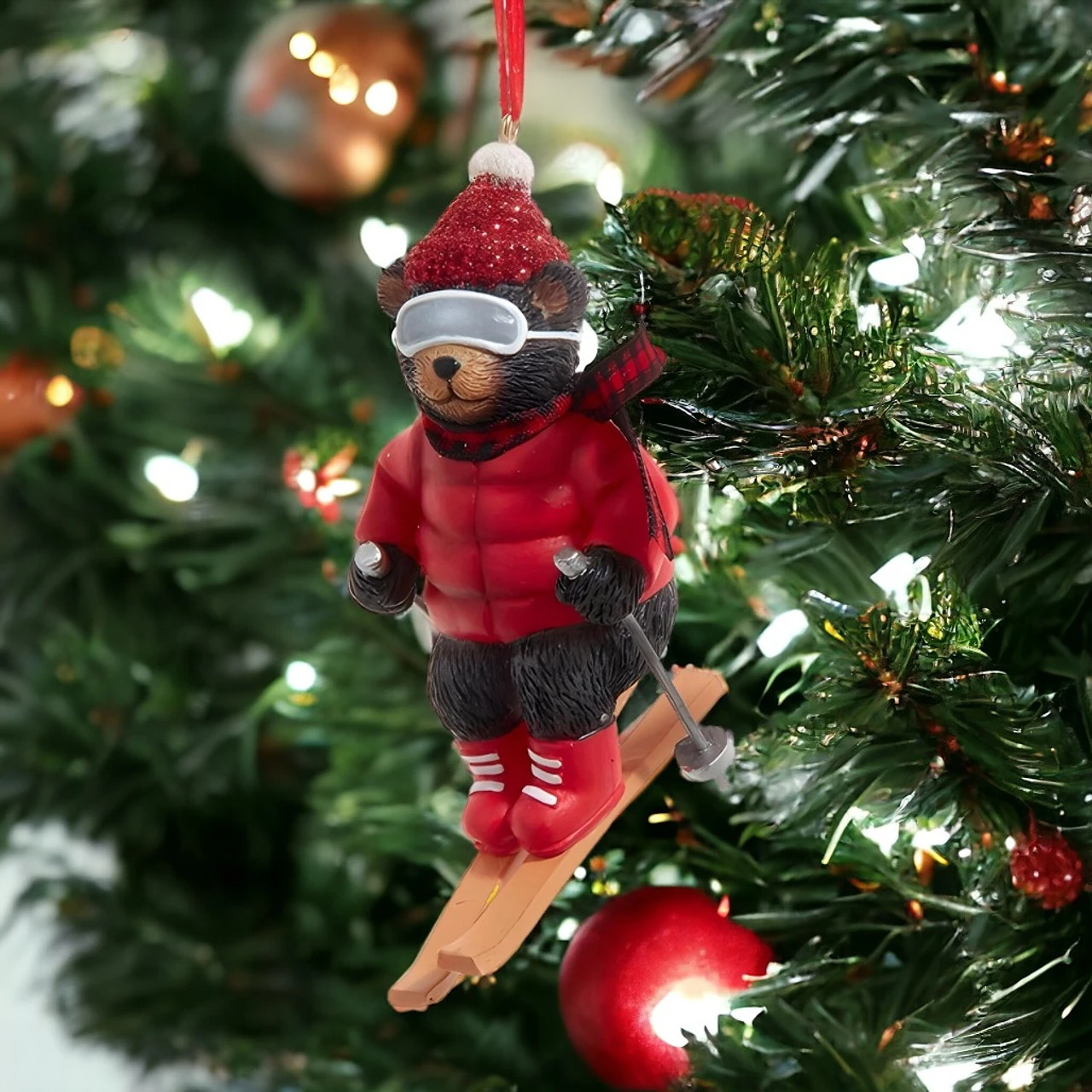 Hit the festive slopes with this 3.5″ Skiing Bear Ornament, donning a cozy knit hat and chic white goggles. Crafted from resin, it brings a touch of the lodge life to your tree.