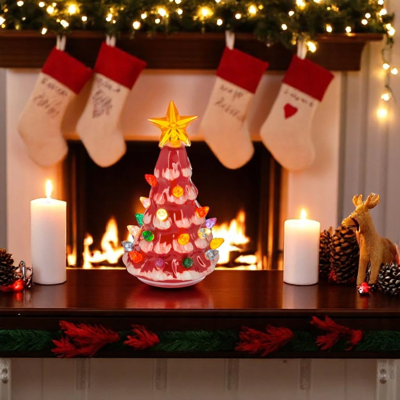 Bring a pop of festive fun to your holiday decor with the LED Light Up Retro Red Tree Mini Shimmers! Standing 4.75 inches tall, this adorable ceramic tree features colorful lights, a cheerful yellow star topper, and a glossy red finish that glows beautifully when lit.