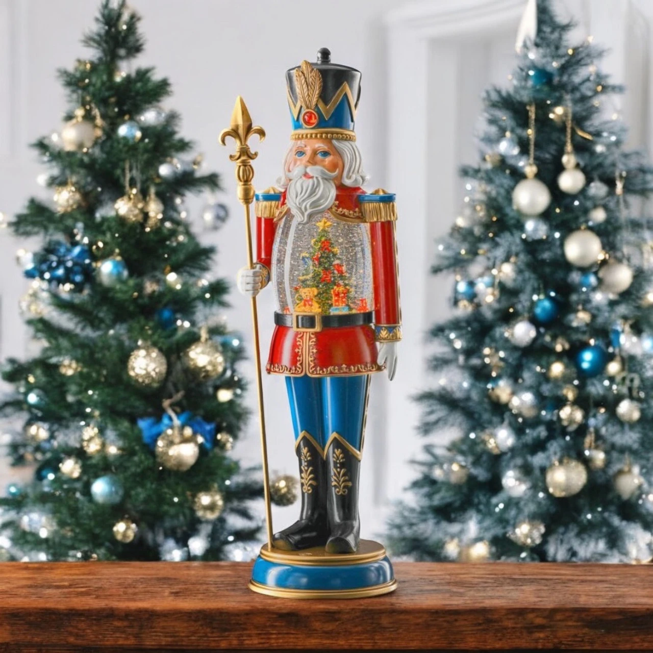 Bring festive magic to your home with the LED Nutcracker Globe! This stately nutcracker stands tall with a built-in glitter globe that illuminates a charming Christmas tree scene. Dressed in regal red, blue, and gold, he holds a golden staff, adding a majestic touch to your holiday décor.