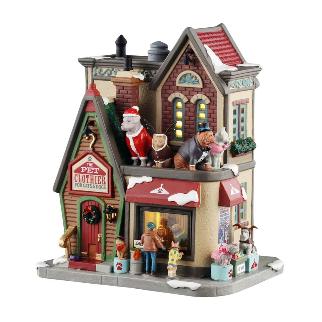 Bring holiday cheer to your furry friends with The Pet Clothier from Lemax. This whimsical, illuminated building is packed with delightful details, including adorable pets in festive outfits, glowing windows, and charming storefront displays.
